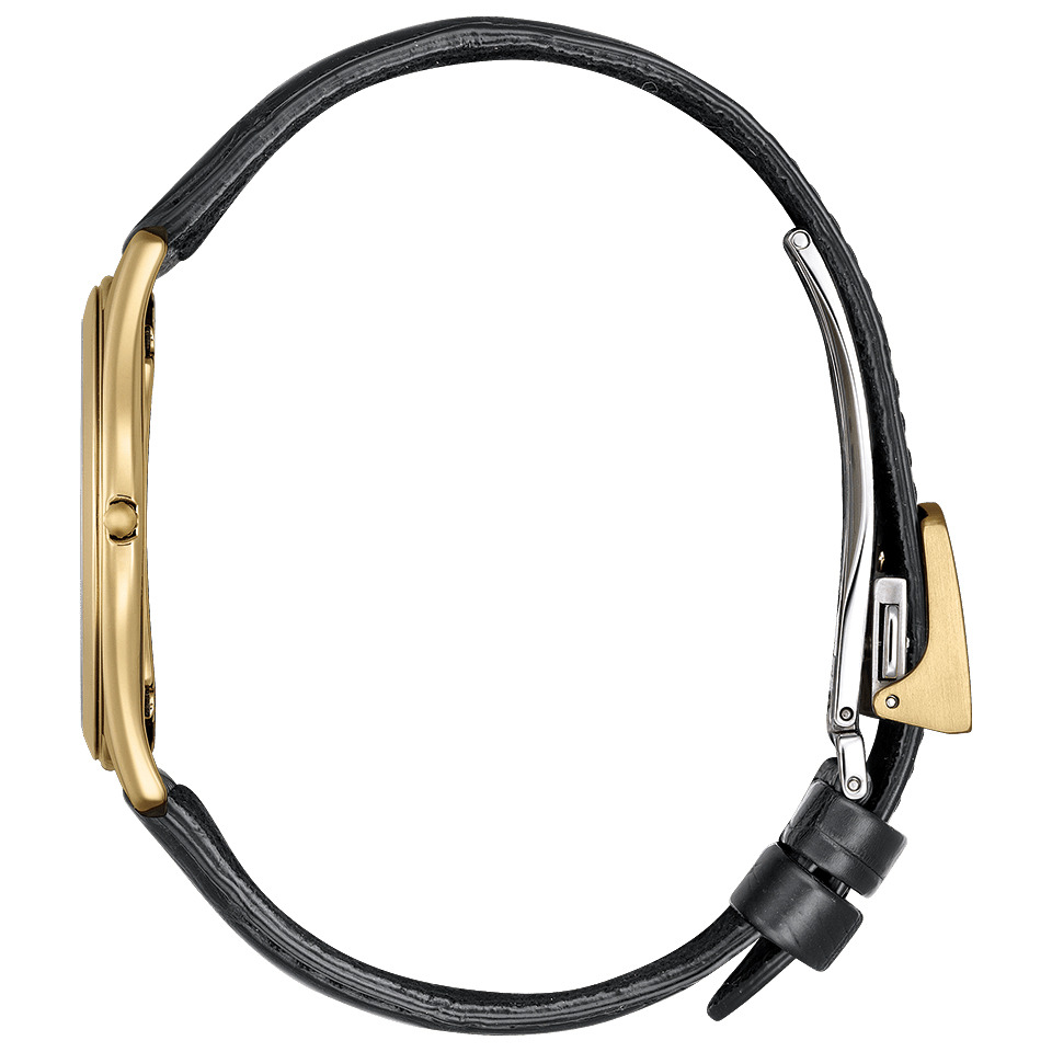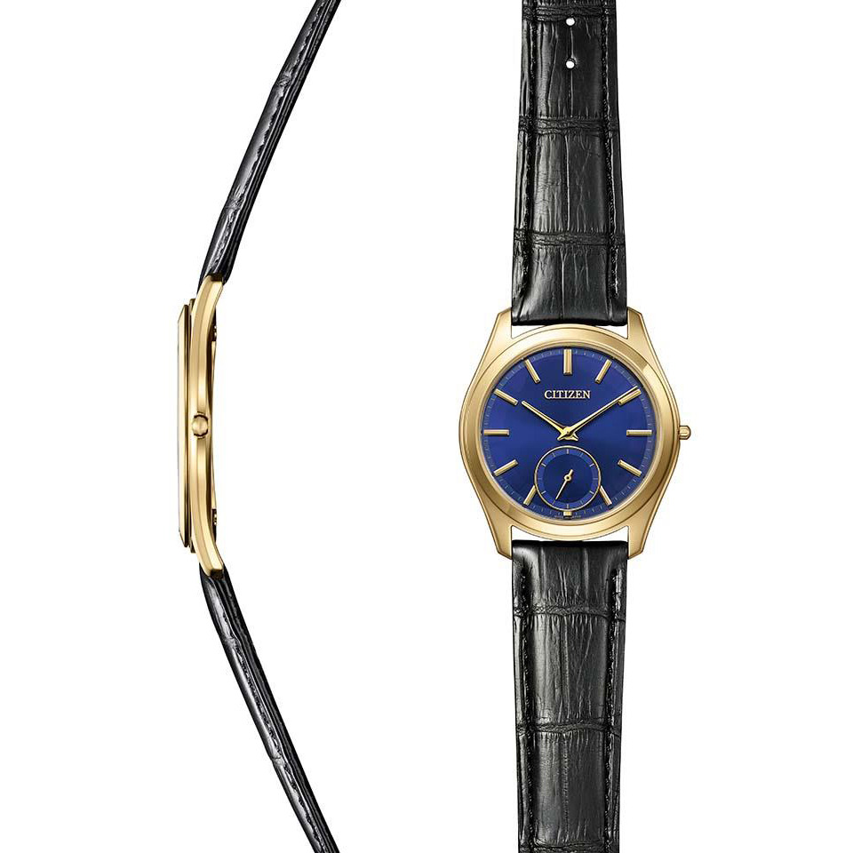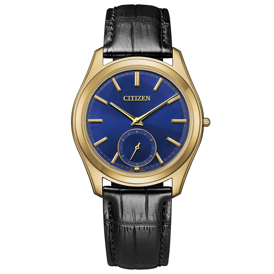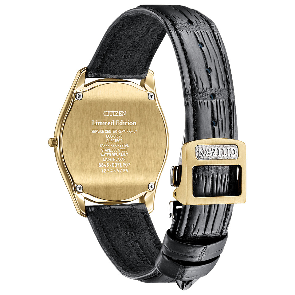 Вторые представленные часы - Citizen Eco-Drive One AQS0202-02L. Эта модель выполнена в более минималистском стиле. Она выполнена из нержавеющей стали с янтарным оттенком золота, имеет темно-синий циферблат и накладные индексы в виде палочек. Корпус часов имеет размер 36,6 мм и толщину всего 4,5 мм, что делает их одной из самых тонких солнечных моделей Citizen. Энергия поступает от калибра 8845 Eco-Drive, который использует свет для подзарядки и избавляет от необходимости замены батареи. Вместо браслета часы поставляются с черным кожаным ремешком и соответствующей застежкой золотистого цвета. Эта версия ограничена 250 экземплярами и поставляется с выгравированным номером серии на задней крышке корпуса.