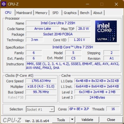 Intel Core Ultra 255H это процессор Arrow Lake H с 16 ядрами (шесть ядер Lion Cove P, до 5,1 ГГц; восемь ядер Skymont E, до 4,4 ГГц; два ядра Low Power E, до 2,5 ГГц). Типичный показатель TDP процессора составляет 28 Вт, но он может потреблять до 115 Вт, если так настроено производителем. Больше сравнений можно провести с помощью нашего Список бенчмарков для процессоров.