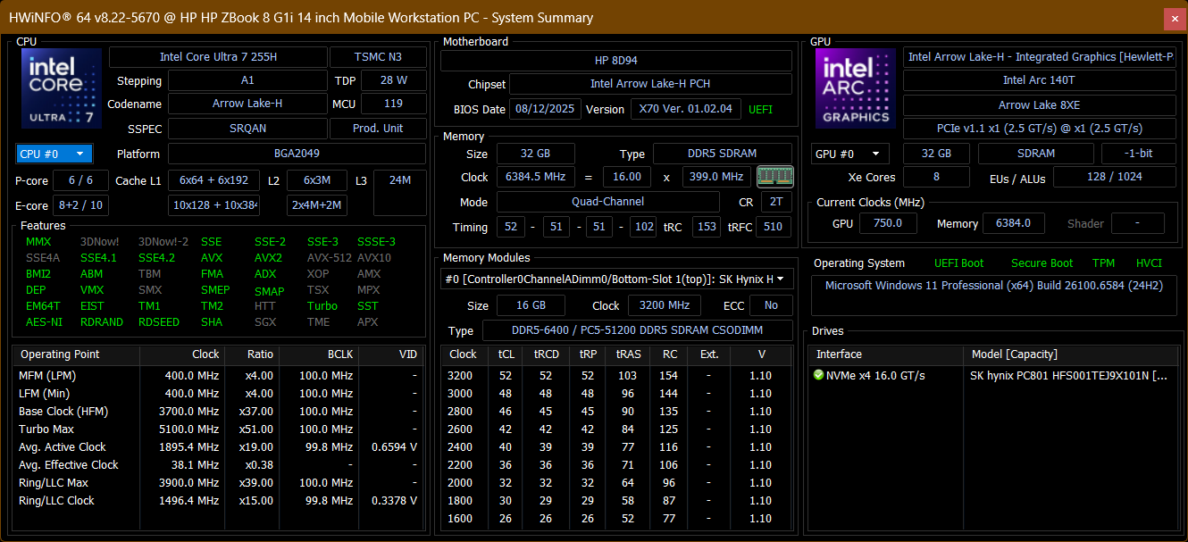| HP ZBook 8 G1i 14 Arc 140T, Ultra 7 255H, SK hynix PC801 HFS001TEJ9X101N | HP ZBook Firefly 14 G11 RTX A500 Laptop GPU, Ultra 7 165H, Kioxia XG8 KXG80ZNV512G | Lenovo ThinkPad P14s Gen 6 21RV0017GE Radeon 890M, Ryzen AI 9 HX PRO 370, SK hynix PC801 HFS001TEJ9X162N | HP ZBook Ultra G1a 14 Radeon 8060S, Ryzen AI Max+ PRO 395, WDC PC SN810 2TB | Dell Precision 5000 5490 RTX 3000 Ada Generation Laptop, Ultra 9 185H, Kioxia XG8 KXG80ZNV1T02 | |