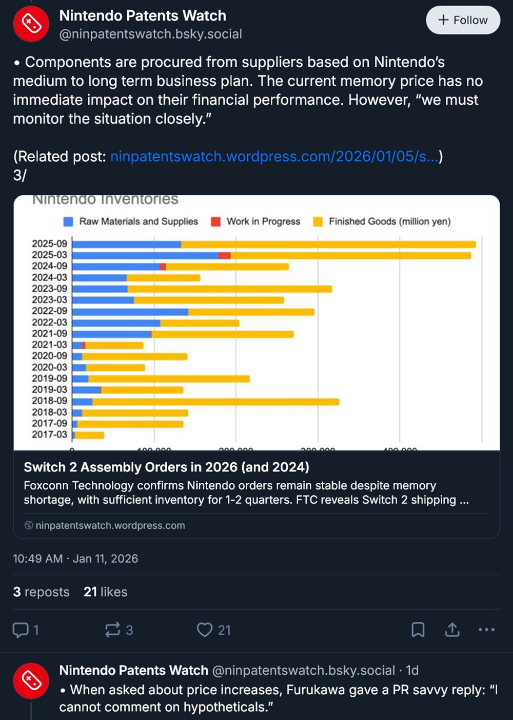 Беспрецедентные цены на память цены на память повышают стоимость игровых ПК, но и консоли тоже находятся под угрозой. Kyoto Shimbun (paywalled) спросила президента Nintendo Шунтаро Фурукава о возможных последствиях для последней портативной консоли компании. Аккаунт Bluesky на сайте Patents Watch перевел некоторые ключевые моменты, включая вопрос о Повышение цены на Switch 2.