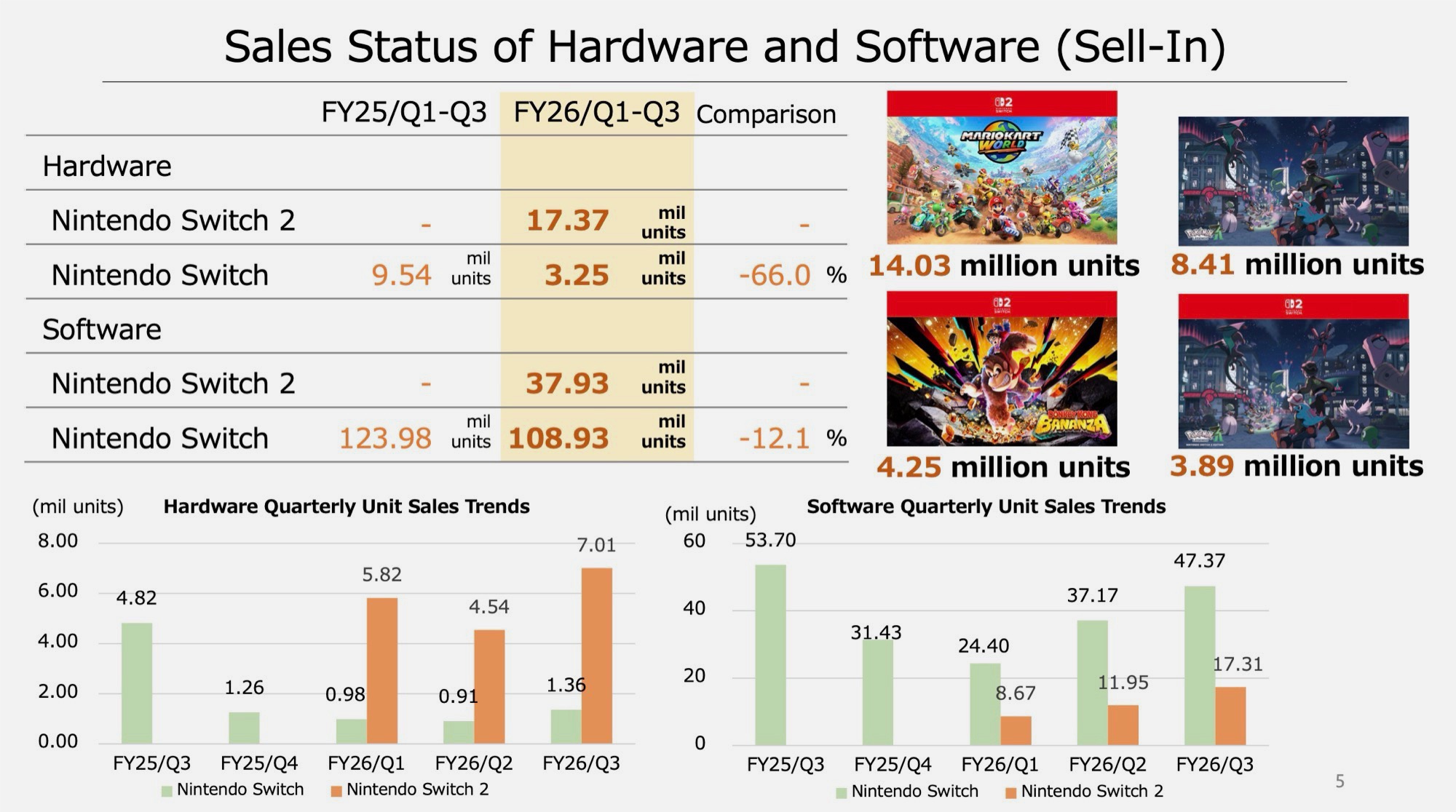 Самой продаваемой игрой сталаMario Kart World с 14,03 миллионами проданных копий, за ней следует Pokémon Legends: Z-A с 12,3 миллионами. Обеим играм, вероятно, помогло то, что они были включены в официальные комплекты поставки консоли. Интересно, что, несмотря на технические проблемы (о которых говорится в видеоролике Digital Foundry ниже), на версию для оригинальной Switch пришлось 8,41 млн. экземпляров Pokémon Legends: Z-A