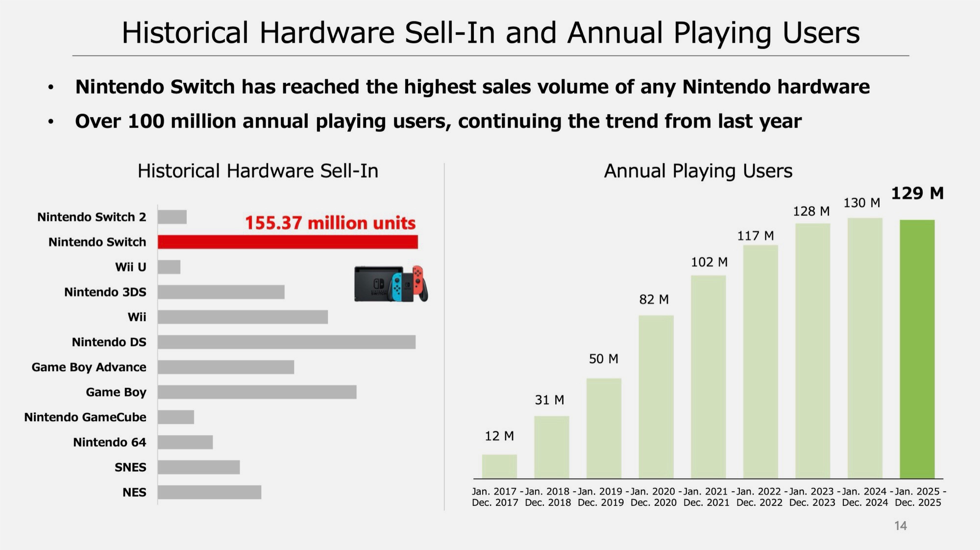Несмотря на то, что это консоль последнего поколения, оригинальная Switch все же смогла продать 3,25 миллиона устройств - на 66% меньше, чем за тот же период прошлого года. Nintendo продала в общей сложности 146,9 миллиона игр, 37,93 миллиона из которых были специально оптимизированы для Switch 2.