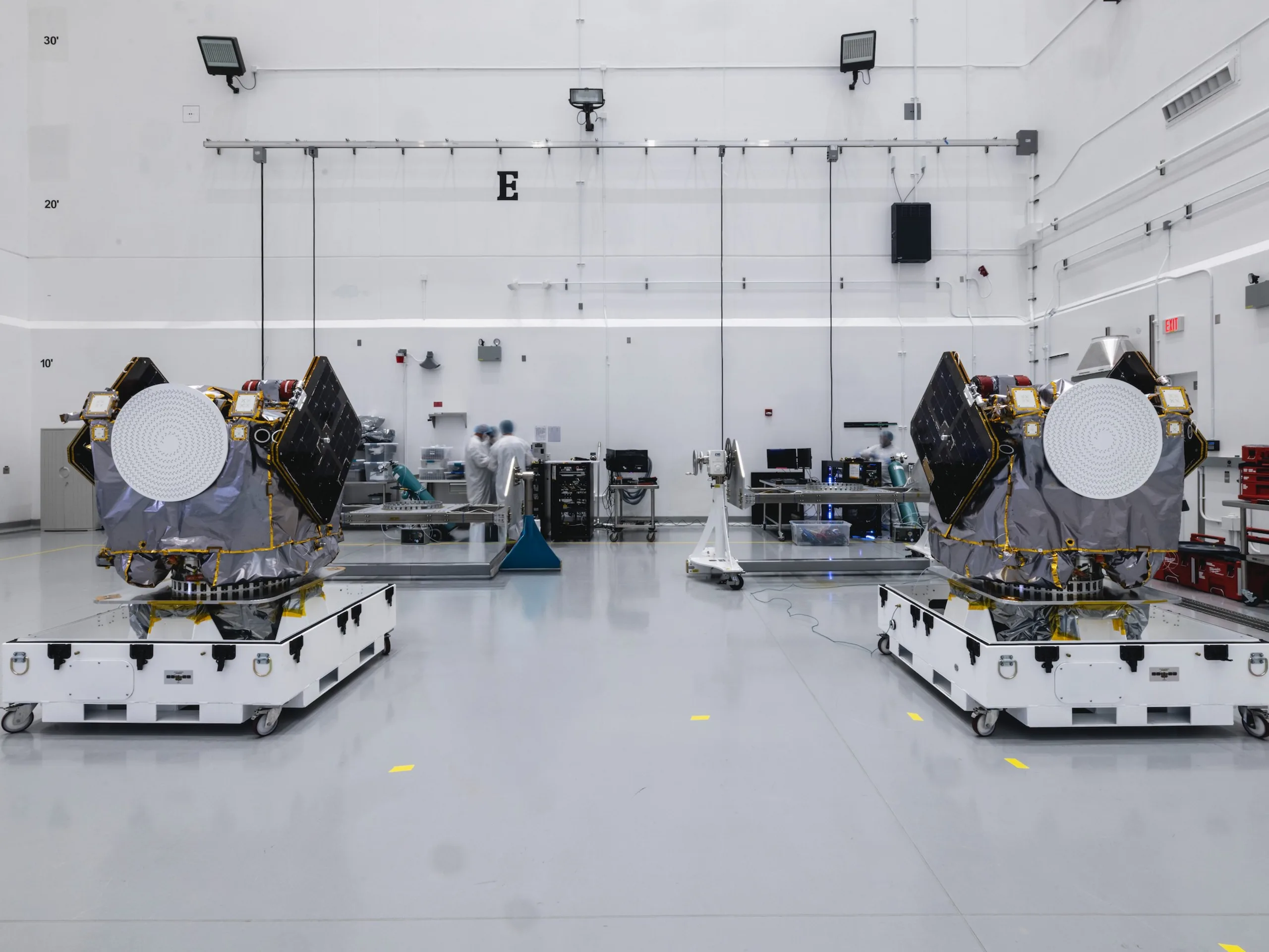 Космические аппараты прибыли в центр космических операций Astrotech в Титусвилле, штат Флорида, 16 сентября. Там инженеры завершат проверки и функциональные тесты, прежде чем оба космических аппарата будут готовы к запуску.