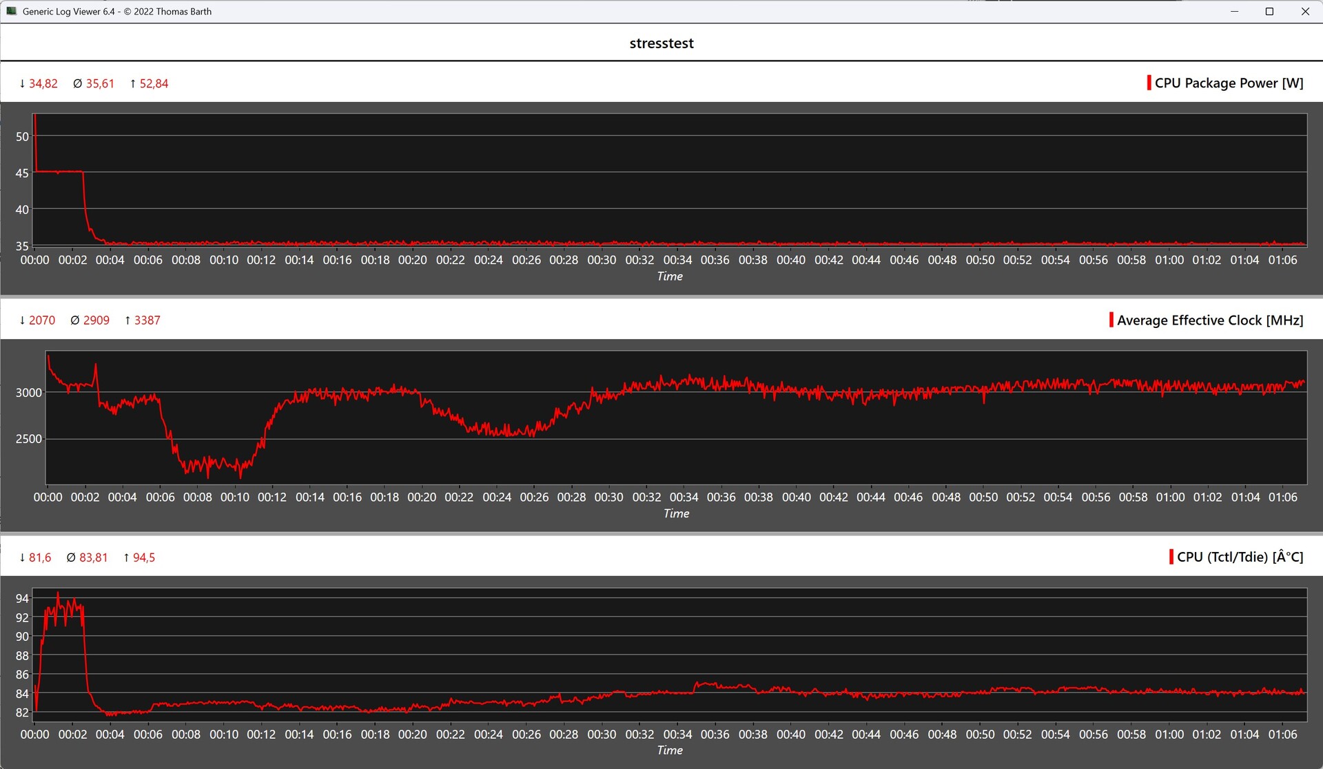 Благодаря продуманной конструкции охлаждения корпус Alliwava H90 Pro остается преимущественно холодным даже при высокой нагрузке. Только в области задних вентиляционных отверстий наблюдается заметный нагрев. В стресс-тесте AMD Ryzen 7 8745HS ненадолго достигает температуры около 94 C, но это все еще в пределах безопасного диапазона. Среднее энергопотребление APU составляет около 35 Вт.