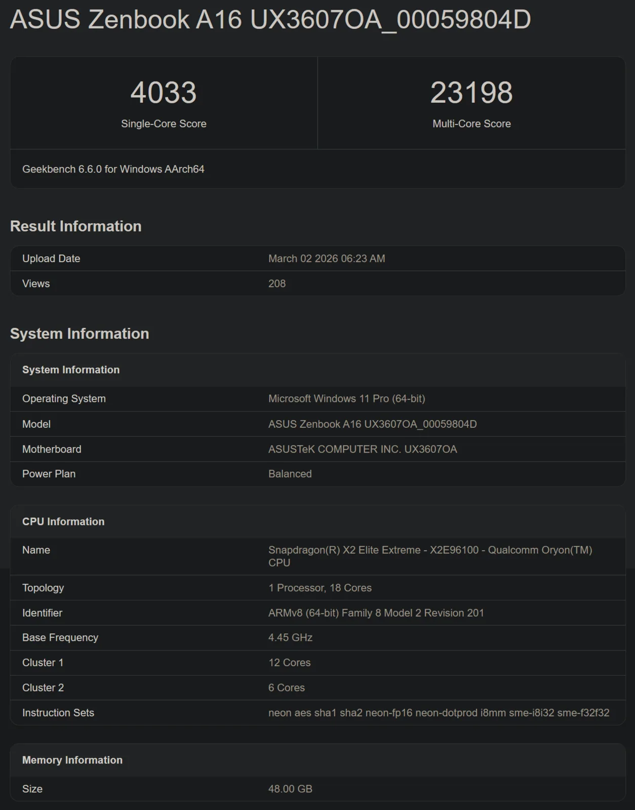 Производительность процессора и GPU Snapdragon X2 Elite Extreme X2E-96-100 впечатляет в дебютном Geekbench на ноутбуке Asus