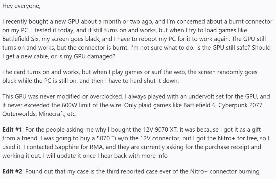 Хорошо то, что компания Sapphire, похоже, согласилась принять запрос на RMA от пользователя и либо заменит, либо починит пострадавший RX 9070 XT.