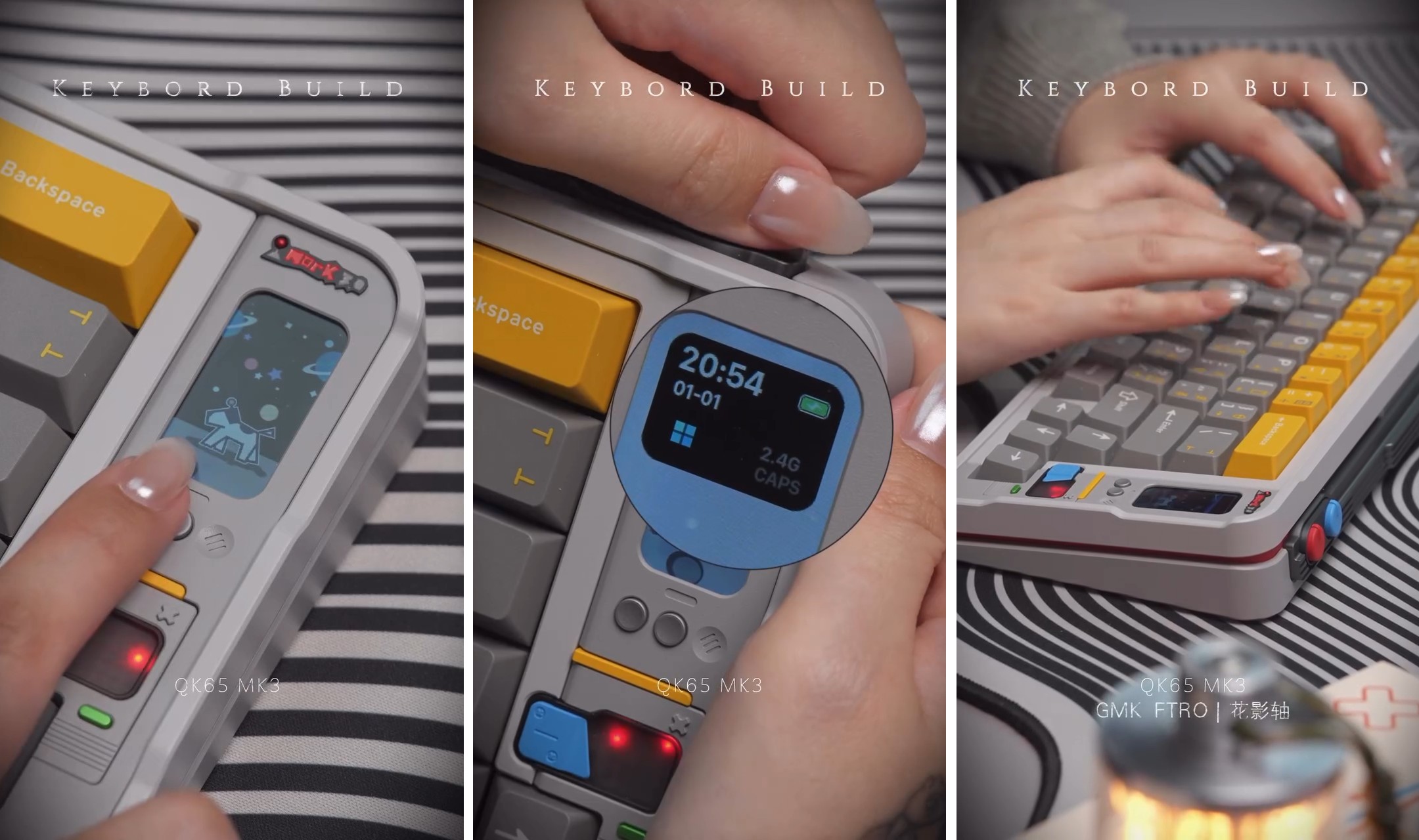 QK65 MK3 выполнен в ретро-сером и матово-сиреневом цвете, напоминающем о классических консолях, таких как Super NES и Game Boy. Цветной дисплей расположен на правом краю клавиатуры, под ним находятся две кнопки для управления встроенными играми, а также небольшой динамик. Экран также может отображать состояние системы и другую информацию, а две ручки в старом стиле на верхнем краю позволяют пользователям переключаться между режимами подключения и операционными системами.