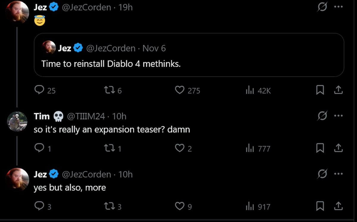 Корден напомнил геймерам о заявлении от 6 ноября, в котором он предложил переустановить Diablo 4. Совсем недавно , отвечая на вопрос о скульптурной путанице, он отверг возможность выхода God of War. Затем один из читателей спросил Кордена о возможном расширении Diablo 4, что вызвало ответ "да, но еще и еще".