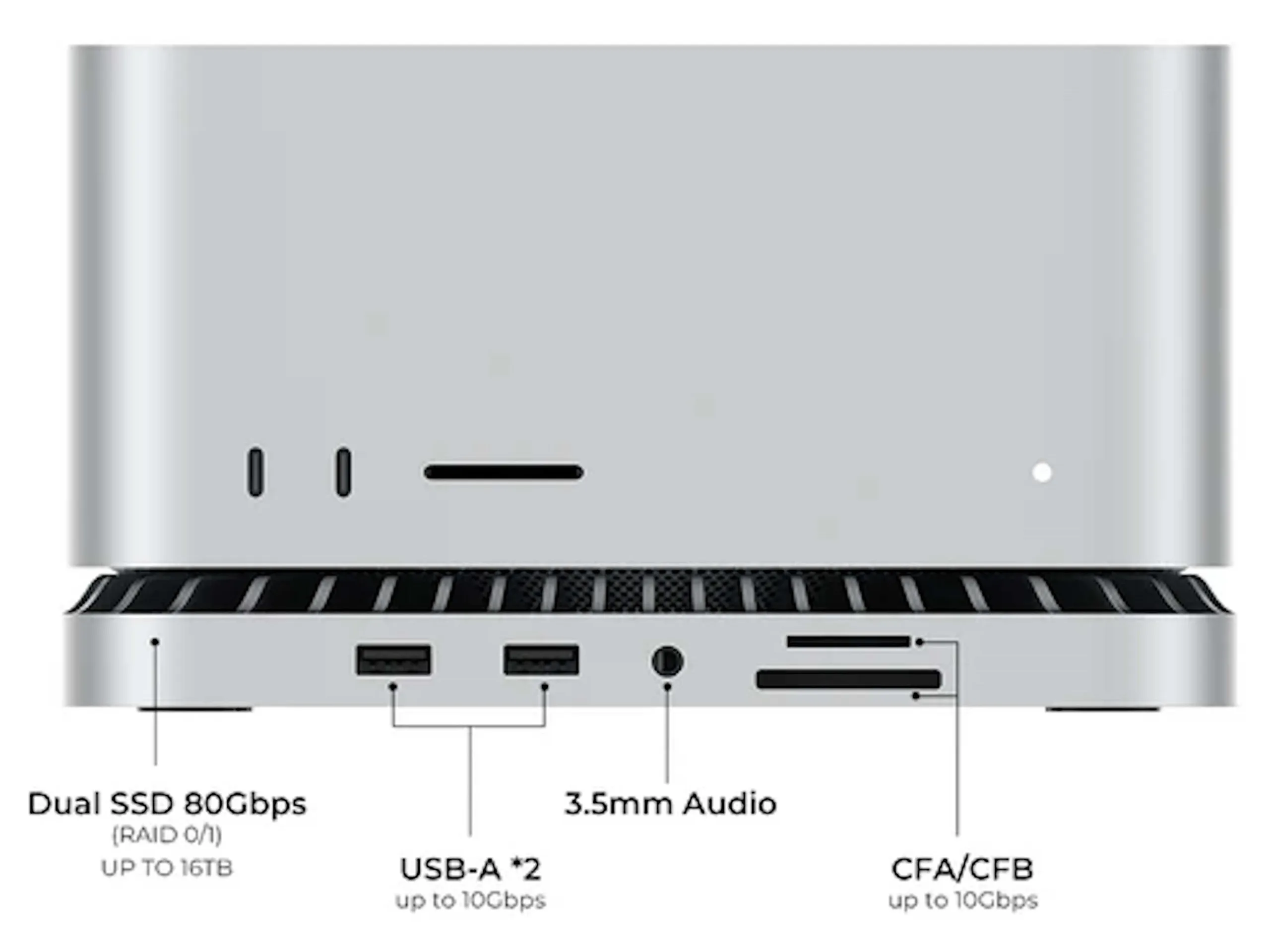 Док-станция подключается к Mac Studio через Thunderbolt 5, передача данных происходит со скоростью до 80 Гбит/с. Аксессуар вмещает два SSD-накопителя, что означает, что к Mac Studio можно добавить до 16 ТБ памяти. Поддерживаются конфигурации RAID 0 и RAID 1, а также карты CFexpress со скоростью передачи данных до 10 Гбит/с. Кроме того, есть два порта USB 3.2 Type A и обычный 3,5-мм разъем для наушников.