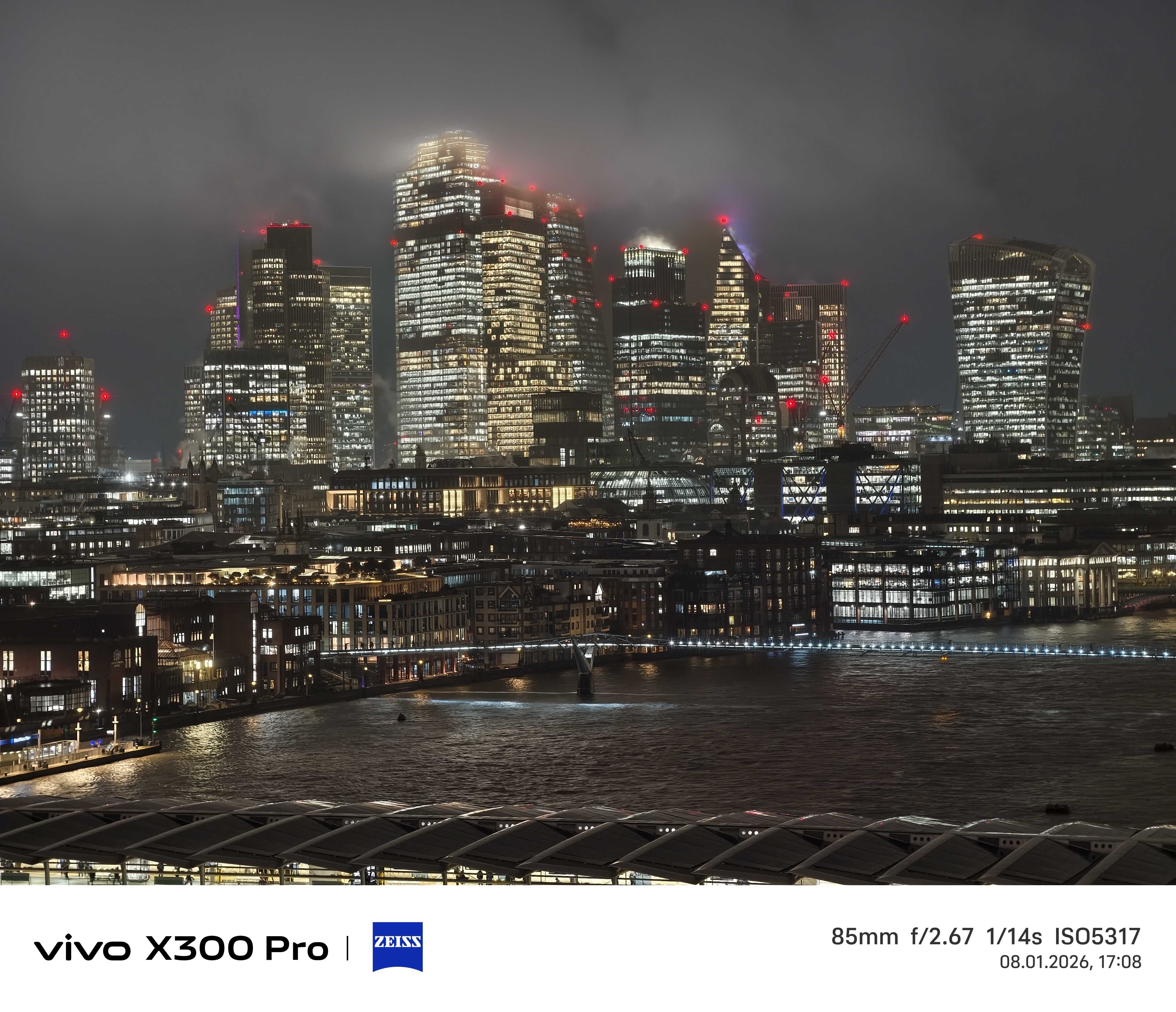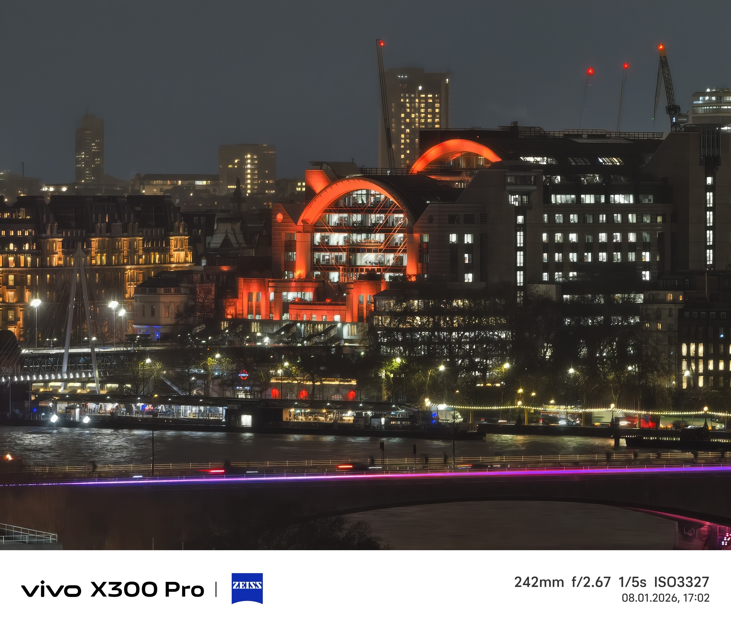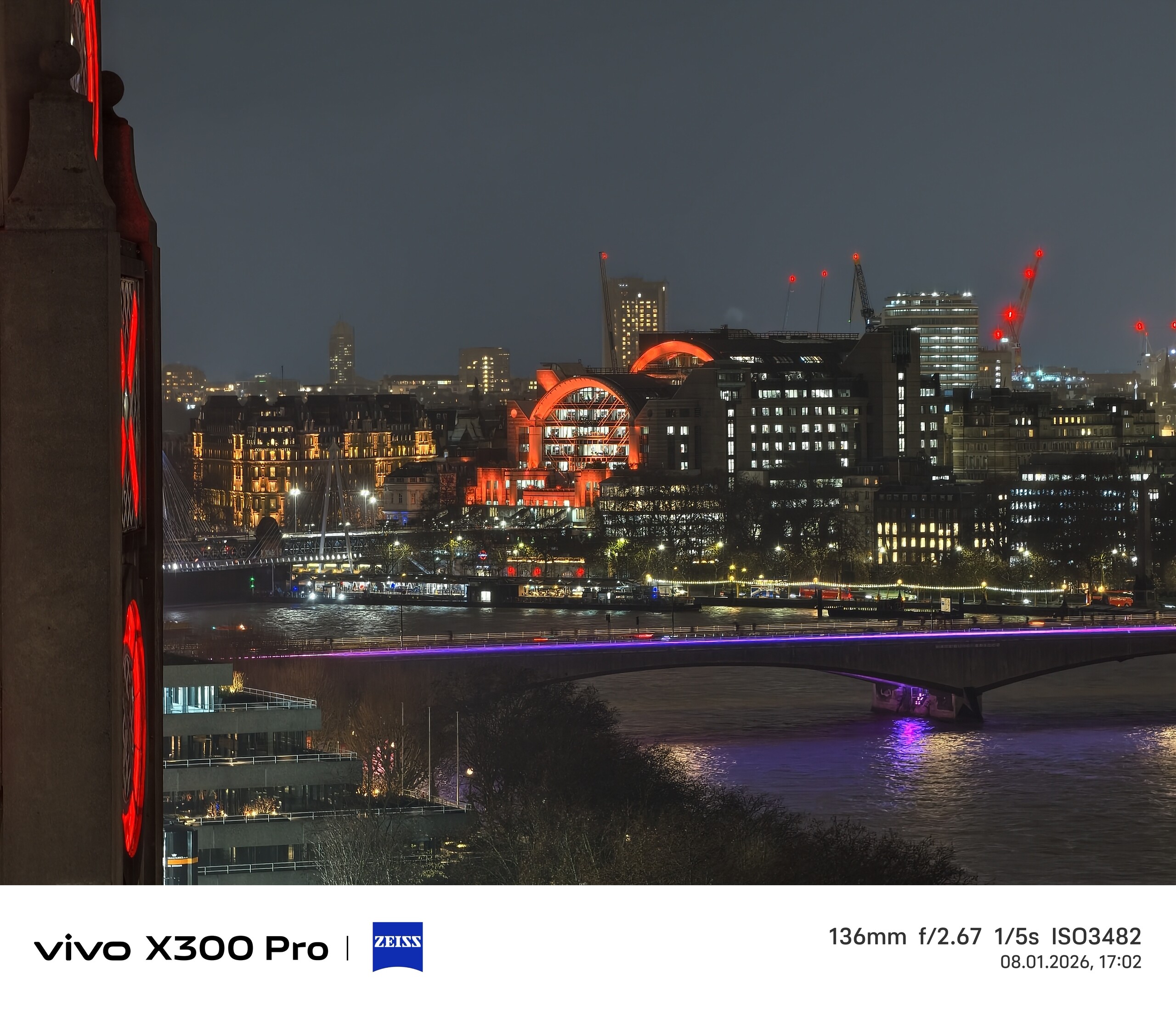 Ночью Vivo X300 Pro выигрывает за счет более светочувствительного оборудования и обеспечивает лучшее качество изображения, что особенно заметно на мелких деталях, таких как деревья на берегу (1-е изображение) или перила моста (2-е изображение).