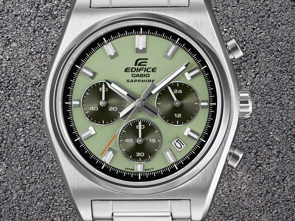 Часы Edifice EFB-730 от Casio оснащены тремя аналоговыми стрелками, точность которых, как утверждается, не превышает 20 секунд в месяц. Имеется основной указатель даты и три дополнительных циферблата, один из которых показывает время в 24-часовом формате. Два других малых циферблата связаны с 1-секундным секундомером, отображающим прошедшие секунды и минуты. Эти часы водонепроницаемы до 100 м и должны работать около трех лет от батарейки SR920SW.
