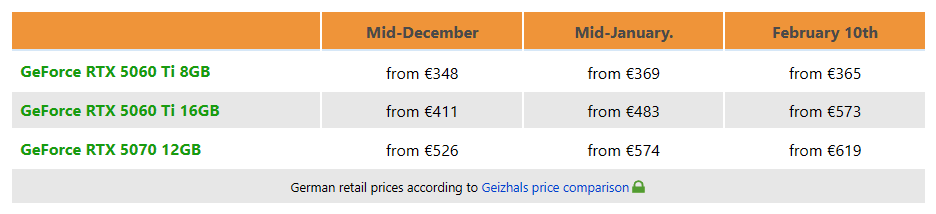 Если в середине декабря цена RTX 5060 Ti 16 ГБ составляла €411 против €526 у RTX 5070, то сейчас RTX 5060 Ti 16 ГБ стоит всего €46 меньше, чем RTX 5070 RTX 5070.