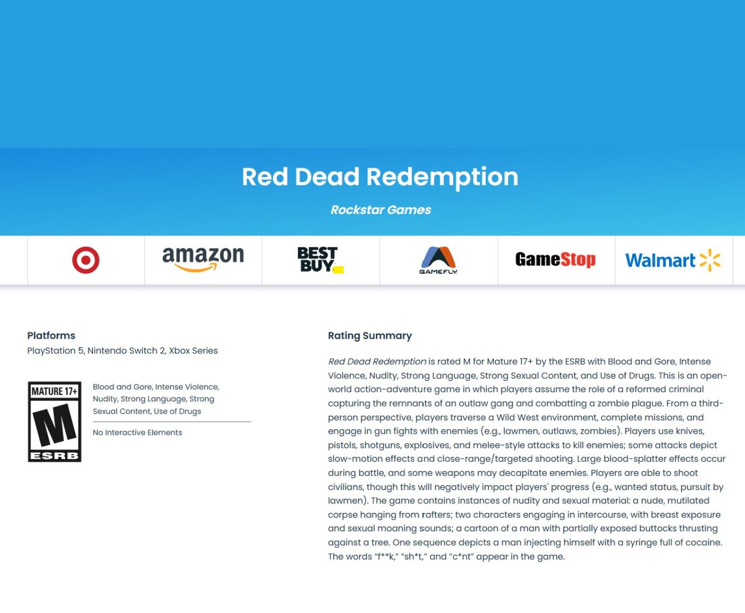 В листинге указана классификация "M for Mature 17+" с такими описаниями, как кровь и кровь, интенсивное насилие, нагота, сильный язык, сильный сексуальный контент и использование наркотиков. Особенно выделяется раздел платформ, в котором прямо названы консоли PlayStation 5, Nintendo Switch 2 и Xbox Series. ESRB явно упоминает зомби в качестве внутриигровых врагов, что еще раз подтверждает, что рейтинг предназначен для Red Dead Redemption 1 и его DLC-кампании Undead Nightmare .
