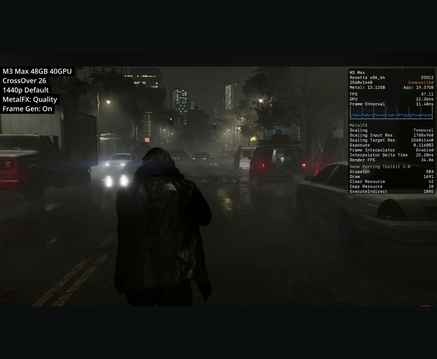 Новые машины работают гораздо лучше. Игра была запущена на M3 Max MacBook Pro с 48 ГБ объединенной памяти и 40-ядерным GPU через CrossOver 26. В родном 1080p с настройками графики по умолчанию, отключенным MetalFX и выключенной генерацией кадров, система поддерживала около 70 FPS в сцене на открытой улице, показывая, что аппаратное обеспечение может комфортно работать с игрой, не прибегая к апскейлингу. Наложение также показывает работу игры через слой Apple'Game Porting Toolkit с временем смены кадров около 14 мс, при этом используется около 10,5 ГБ памяти GPU.