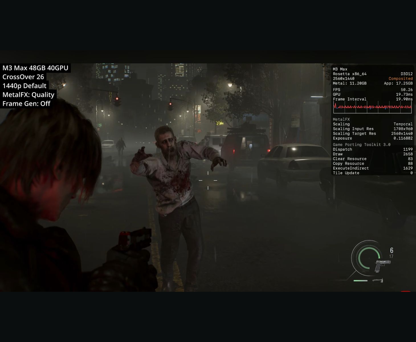 Отдельный тест при разрешении 1440p с использованием качественного масштабирования MetalFX Quality показывает, что игра работает со скоростью около 50 FPS, а время смены кадров приближается к 19-20 мс. MetalFX установлен в режим Quality, рендеринг выполняется при 1708 × 960, а затем масштабируется до 2560 × 1440, при этом генерация кадров остается отключенной. Наложение также показывает использование памяти GPU примерно 11,2 ГБ и памяти приложений около 17,2 ГБ.