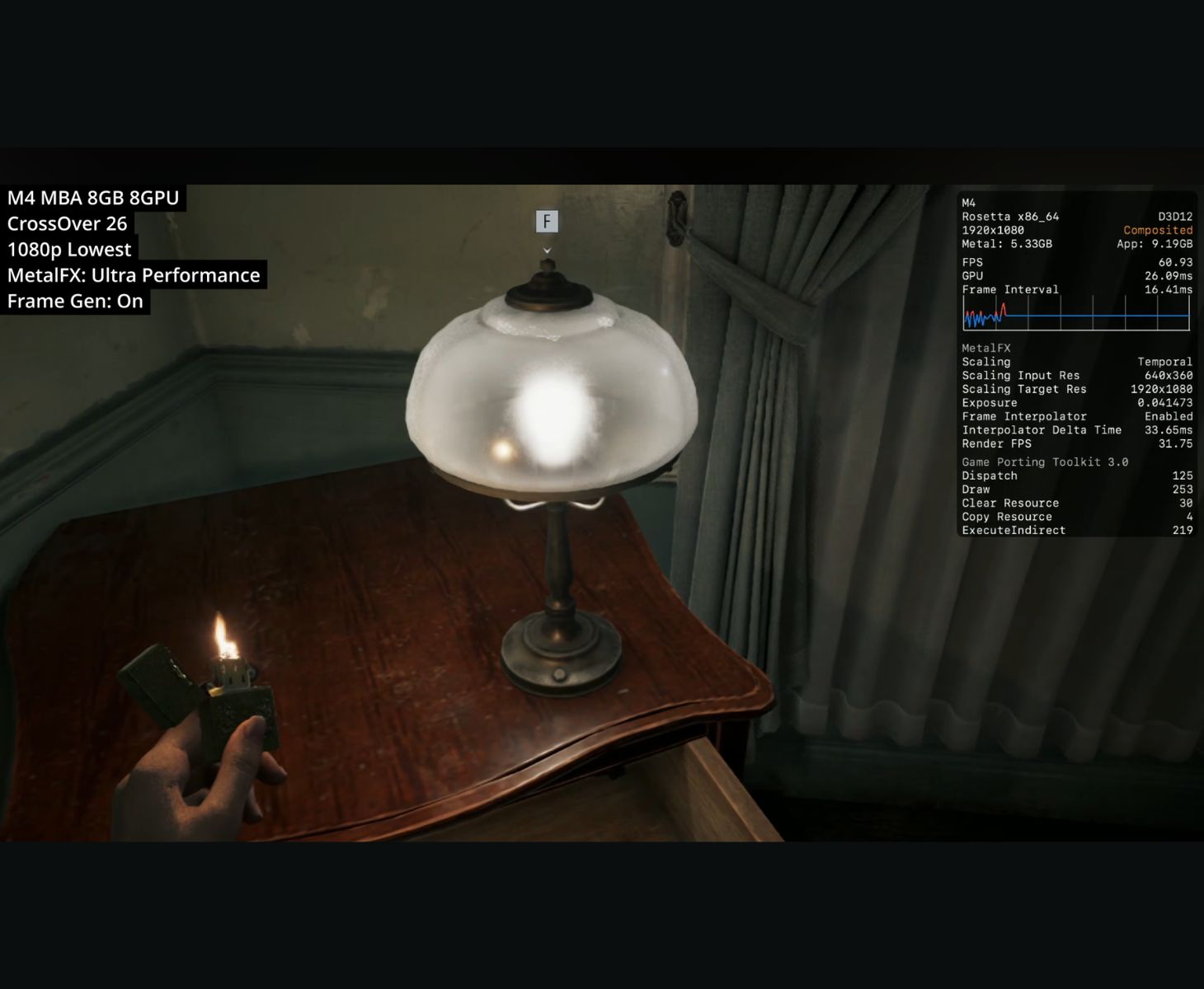 На более доступном MacBook Air на чипе M4игра все еще может работать с некоторыми настройками. Игра была настроена на 1080p с минимальной предустановкой графики, при этом было включено масштабирование MetalFX Ultra Performance и генерация кадров. При такой конфигурации игра достигает около 60 FPS, а время смены кадров приближается к 16 мс. Наложение также показывает FPS рендеринга примерно 31-32 FPS, что указывает на то, что генерация кадров помогает увеличить конечную частоту кадров. Объем памяти GPU составляет около 5,3 ГБ, а памяти приложений - около 9,1 ГБ.