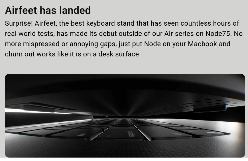 NuPhy Node75 также будет оснащен ножками, которые позволяют размещать клавиатуры, подобные серии Air, на верхней части стандартной клавиатуры Apple MacBook без задействования встроенных клавиш ноутбука.