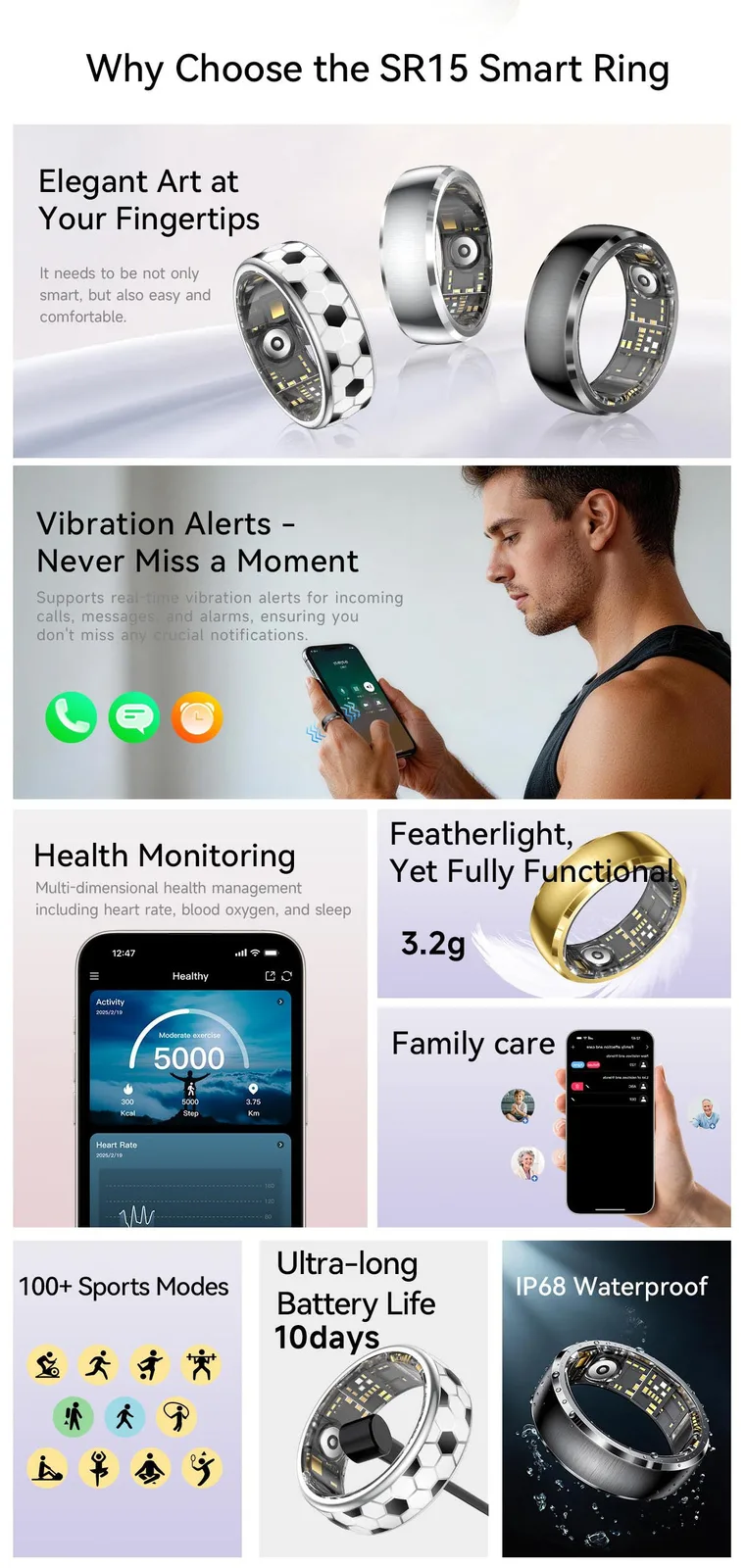 SR15 включает в себя несколько интерактивных функций. Встроенный вибромотор обеспечивает тактильное оповещение о входящих звонках, сообщениях и сигналах тревоги прямо на пальце. Пользователи также могут использовать управление жестами, например, двойное касание, для навигации по музыке, электронным книгам или коротким видео на сопряженном смартфоне. Совместимость охватывает Android 9.0 и iOS 10.0 или более поздние версии.