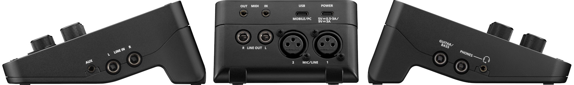 Go:Mixer Studio поддерживает два входа 1/4"/XLR с фантомным питанием, один гитарный/басовый вход, два линейных входа 1/4" (L/R), один вход 1/8" aux и один микрофонный вход для гарнитуры. Интерфейс выводит смешанный аналоговый звук через линейные выходы и выходы для наушников, или цифровой звук с частотой 24 бит, 44,1 кГц - 192 кГц через порт USB-C.
