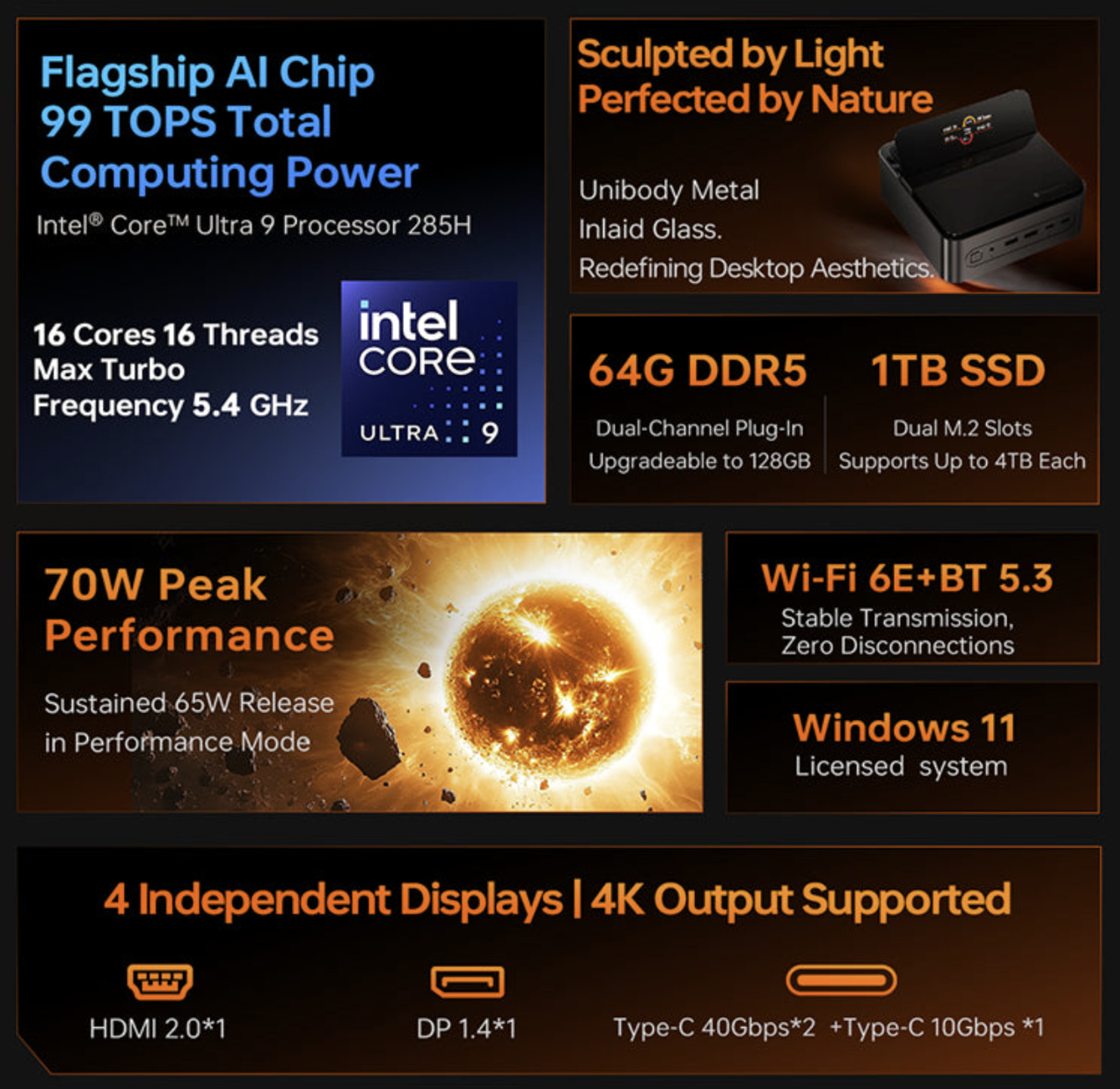 В результате, мини-ПК поступил в продажу по довольно дорогой цене - $1,799. За эту цену Machenike GTS поставляется с Core Ultra 9 285H процессором, 64 Гб оперативной памяти DDR5 и 1 Тб накопителем PCIe 4.0. Обратите внимание, что второй слот M.2 2280 предназначен для добавления дополнительного хранилища в случае необходимости. Кроме того, два слота SO-DIMM мини-ПК поддерживают до 128 ГБ оперативной памяти DDR5-5600. Пожалуйста, см Сайт Minixpc для получения более подробной информации.