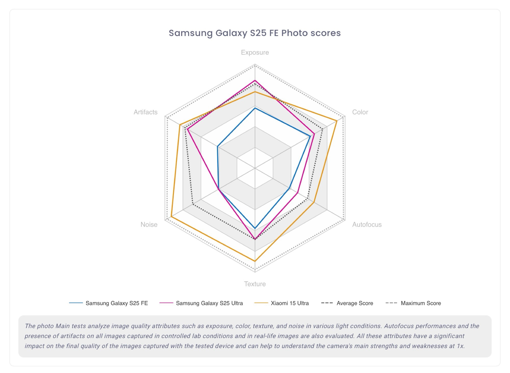 Модель Galaxy S25 FE включает основную камеру 50 МП f/1.8 с 1/1,57-дюймовым сенсором, сверхширокоугольную камеру 12 МП f/2.2 с крошечным 1/3-дюймовым сенсором и телефотокамеру 8 МП f/2.2 с еще меньшим 1/4,4-дюймовым сенсором и 3-кратным оптическим зумом. Углубленный анализ камеры, проведенный DxOMark показал реальную степень компромиссов в этой тройной камере. С результатом 118 баллов Galaxy S25 FE занимает 123-е место в глобальном рейтинге https://www.dxomark.com/smartphones/ - обогнав даже пятилетний Apple iPhone 12 Pro Max (131 балл) и более доступный Google Pixel 6a (122 балла)
