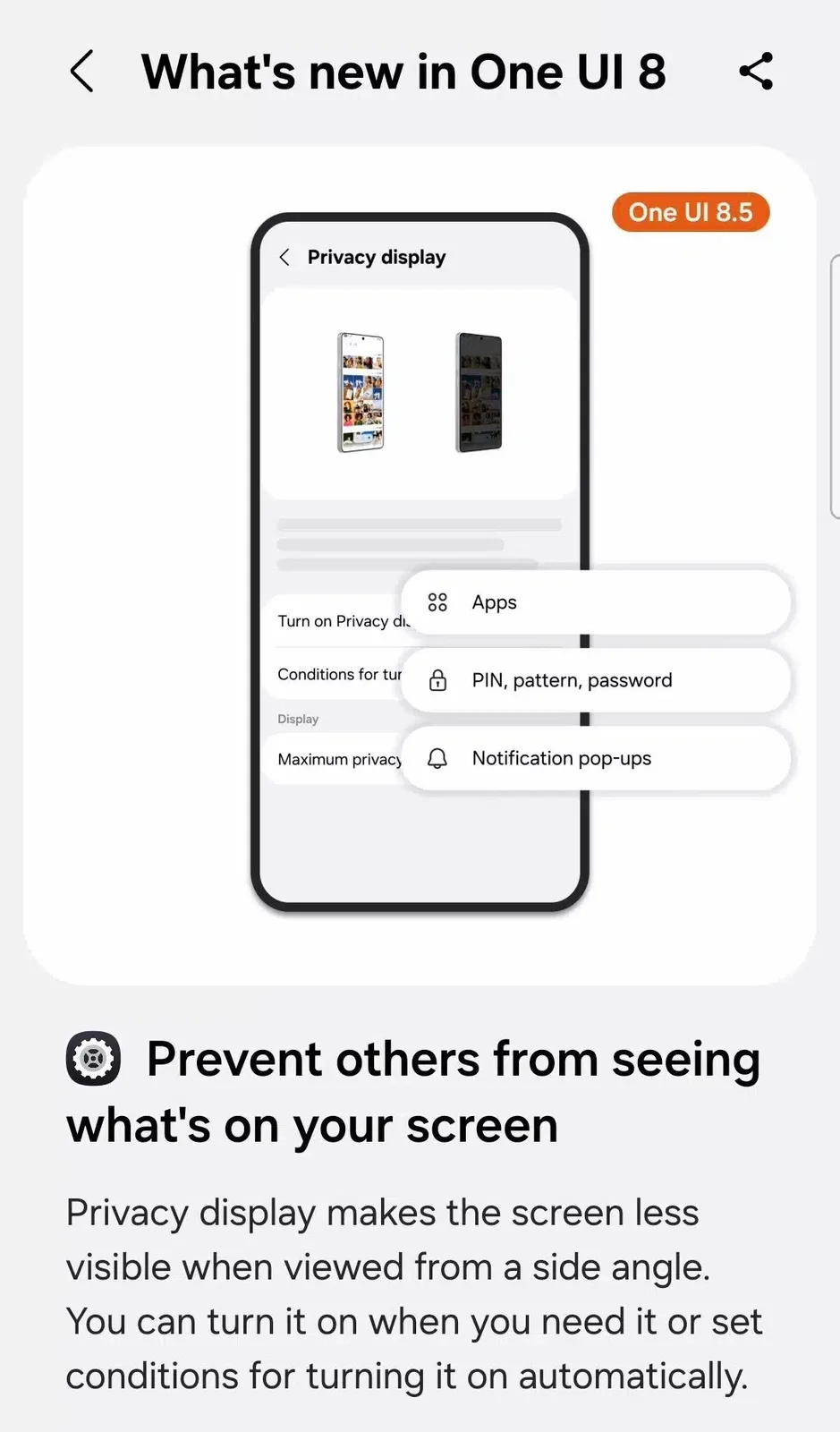 Так называемый дисплей конфиденциальности предназначен для имитации протектора экрана, который значительно ограничивает углы обзора, чтобы посторонним было сложнее увидеть приватные данные. Первые скриншоты диалога настроек для новой функции дисплея уже просочились в октябре 2025 года, а теперь приложение Tips также представило официальное описание этой функции: