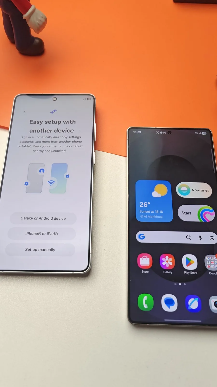 На этих первых снимках нетерпеливый покупатель подносит дорогой белый флагман Samsung к камере и, после первоначальной настройки и переноса данных с Galaxy S25 Ultra(можно приобрести на Amazon), он сразу же сравнивает его с несколькими другими телефонами. Среди них - предшественник, AppleiPhone 17 Pro Max и Vivo X300 Pro.