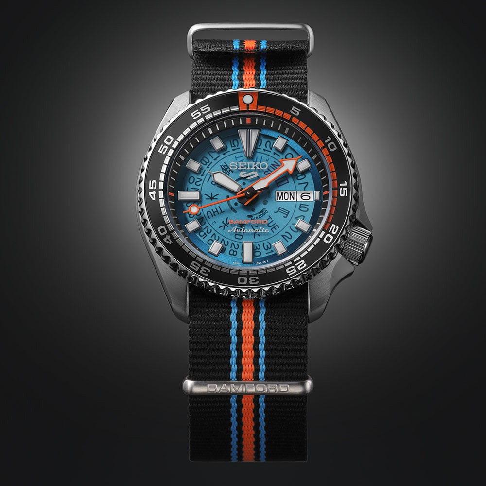 Часовой отдел Bamford пользуется большой популярностью, когда речь заходит об изготовлении элитных часов на заказ. Компания приобрела известность благодаря своим модификациям на заказ для элитных часов, которые сначала были сделаны для культовых швейцарских марок. Позже компания стала официальным кастомайзером для таких брендов группы LVMH, как TAG Heuer и Zenith. Теперь компания Seiko 5 Sports представила новую совместную лимитированную серию с Бэмфордом - Seiko 5 Sports x Bamford Limited Edition (SRPL95K1). Новинка будет выпущена ограниченным тиражом в 2 025 экземпляров по всему миру по цене 400 фунтов стерлингов (~538 долларов США) и будет распространяться только в официальных бутиках.