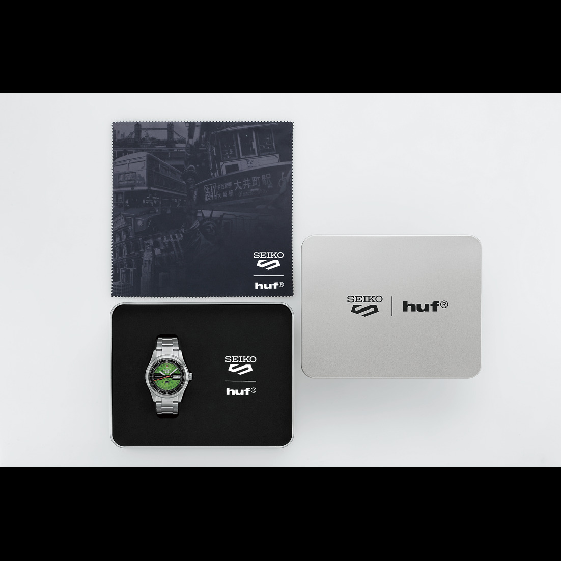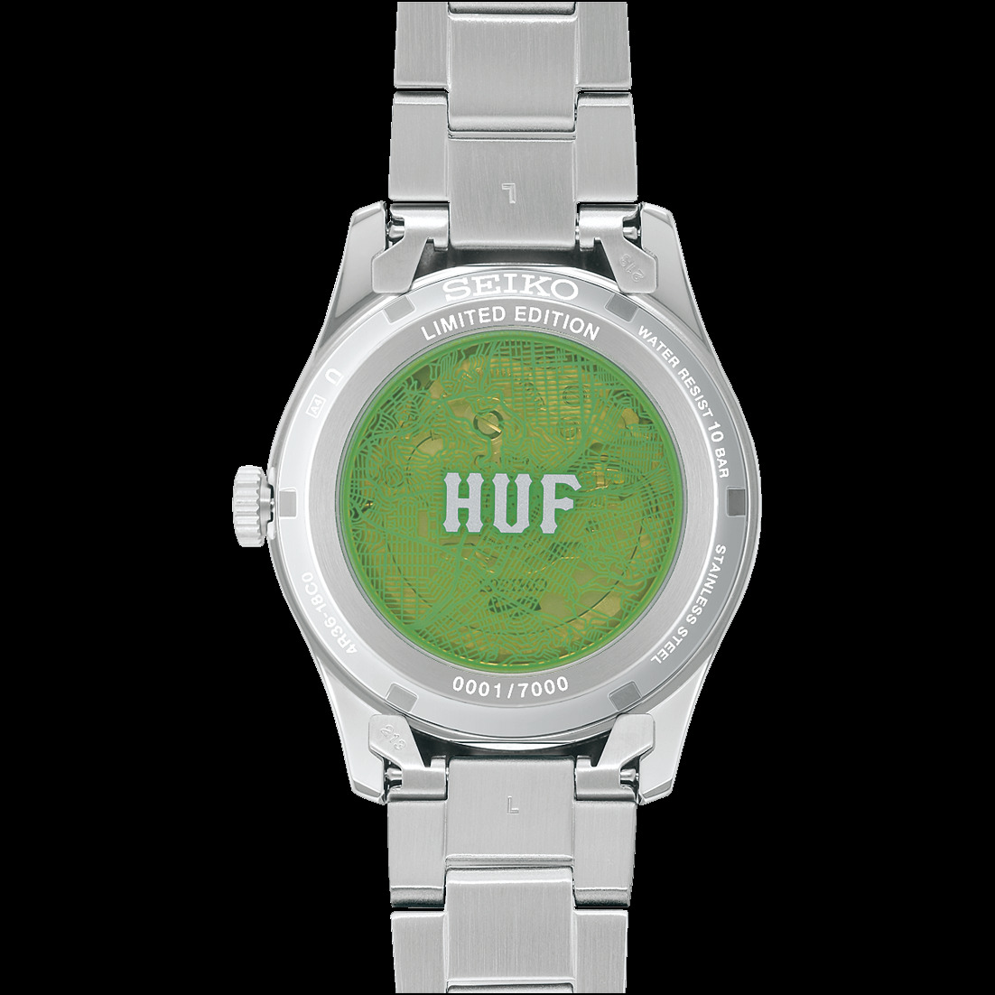 Модель SRPM09 оснащена автоматическим калибром 4R36который имеет запас хода около 41 часа и поддерживает ручной завод и взлом. Выставочная задняя крышка тонирована в тот же фирменный зеленый цвет, что и циферблат, и украшена графикой, вдохновленной Сан-Франциско, где был основан бренд HUF. Часы комплектуются браслетом из нержавеющей стали с шириной ушка 20 мм и поставляются в специализированной фирменной упаковке HUF с чистящей салфеткой.