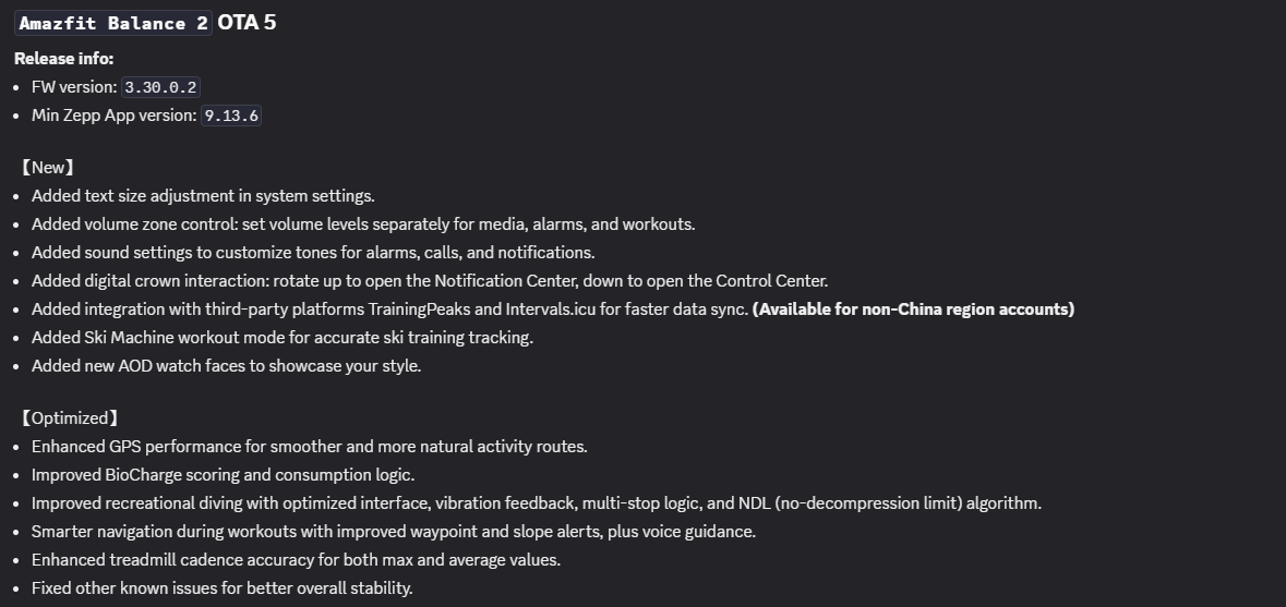 Ожидается, что обновление программного обеспечения версии 3.30.0.2 для смарт-часов Amazfit Balance 2 будет выходить поэтапно. Обычно эти обновления сначала доходят до пользователей в США, Канаде и Китае, а в таких регионах, как Европа, они появляются в приложении Zepp на несколько дней или недель позже.