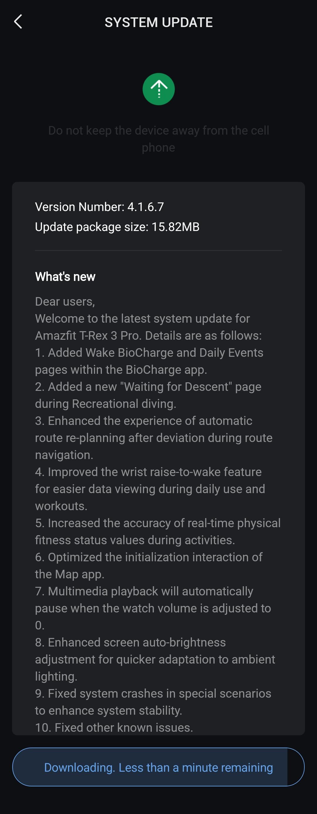 Пользователи T-Rex 3 Pro должны обнаружить, что функция поднятия запястья до пробуждения работает более плавно, а автоматическая регулировка яркости экрана стала более быстрой. Кроме того, когда Вы уменьшаете громкость часов до нуля, Ваша музыка или подкаст теперь автоматически ставятся на паузу. Кроме того, для рекреационного дайвинга появилась новая страница "Ожидание спуска". В примечаниях к выпуску также смутно упоминаются исправления ошибок, некоторые из которых связаны с системными сбоями.
