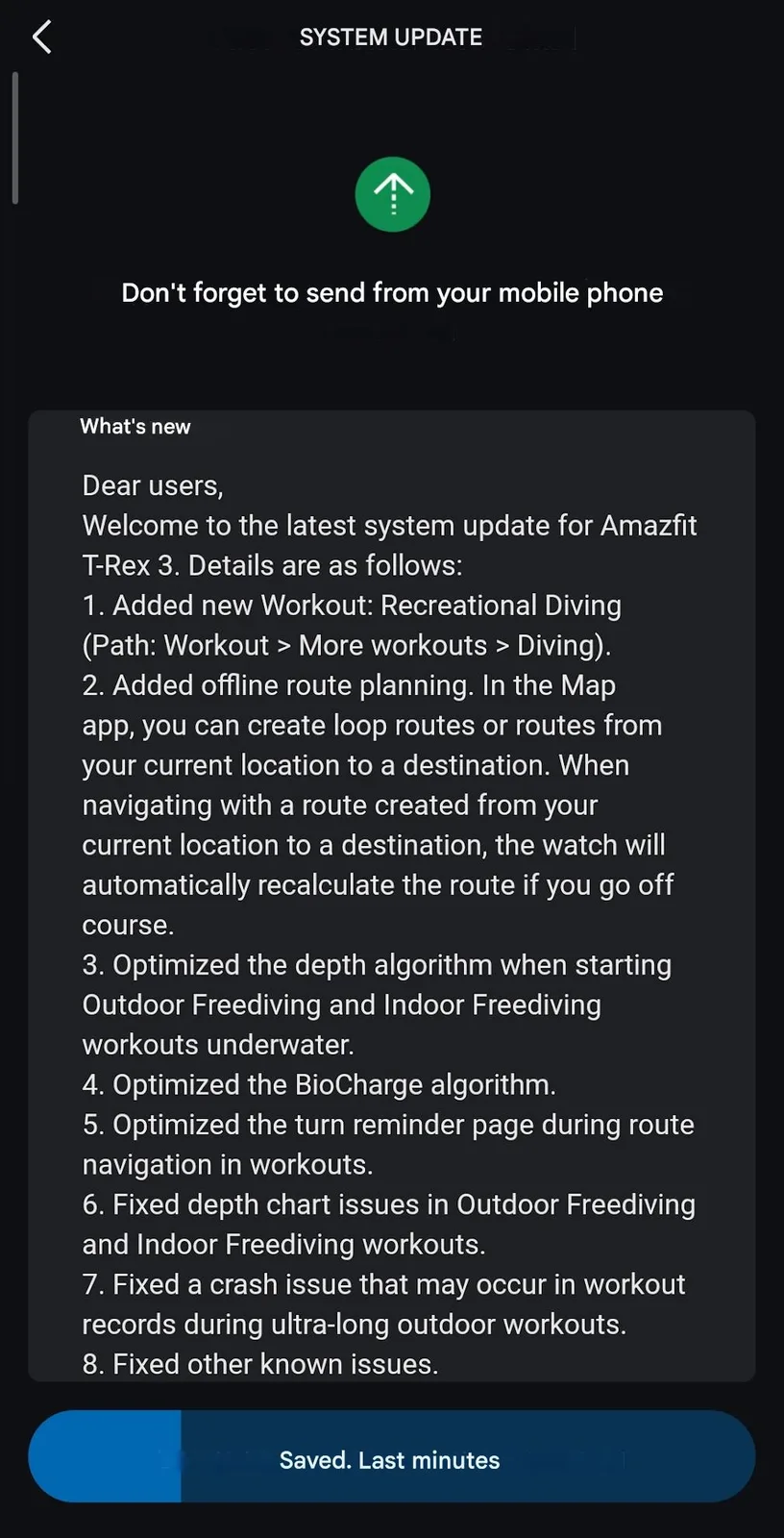 Компания Zepp Health заявляет, что в версии 4.5.3.3 программного обеспечения смарт-часов Amazfit T-Rex 3 оптимизирован алгоритм определения глубины, используемый для тренировок Outdoor Freediving и Indoor Freediving. Сообщается, что алгоритм, лежащий в основе инструмента мониторинга уровня энергии BioCharge, был усовершенствован. Также внесены изменения в страницу напоминания о поворотах, которая отображается при использовании навигации по маршруту во время тренировки. Кроме того, исправлены ошибки, связанные с диаграммами глубины во фридайвинге и сбоями во время сверхдлинных тренировок на открытом воздухе.