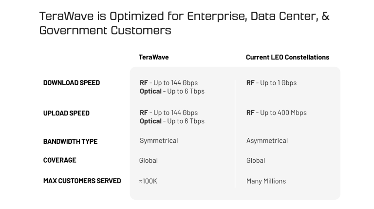 Компания Blue Origin Джеффа Безоса объявила TeraWave, спутниковой интернет-сети, способной обеспечить симметричную пропускную способность до 6 терабайт в секунду и ориентированной на корпоративных клиентов, центры обработки данных и правительственные организации. В отличие от Starlinkкоторая обслуживает миллионы индивидуальных пользователей, TeraWave нацелена на гораздо меньшую клиентскую базу.