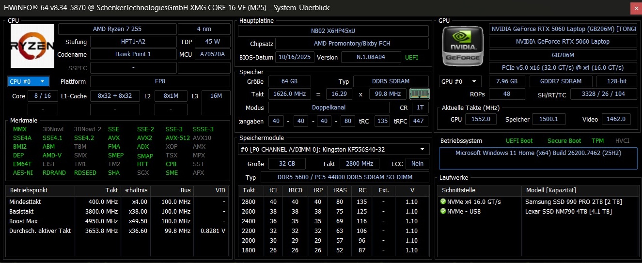 | Schenker XMG Core 16 VE M25 AMD Ryzen 7 255 ⎘ NVIDIA GeForce RTX 5060 Laptop ⎘ 64 Гбайт ОЗУ, 2048 Гбайт SSD | Прейскурантная цена: 1935 EUR | 2.1 килог. | 23 мм | 16.00" 2560x1600 189 PPI IPS | |