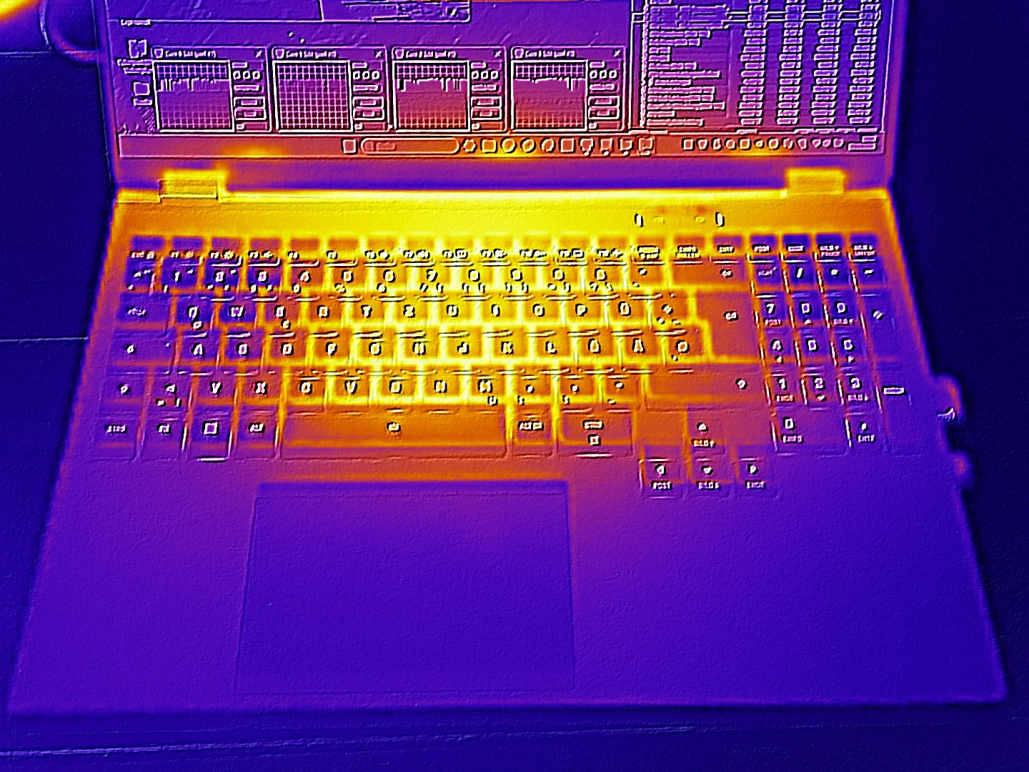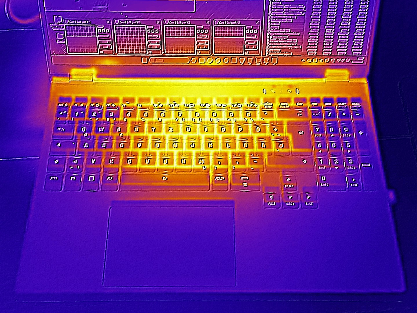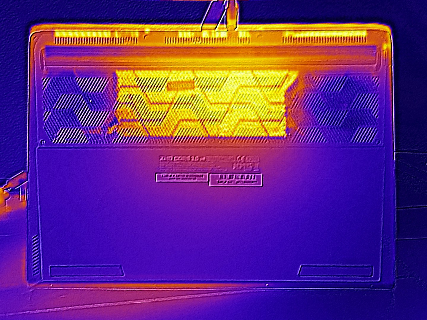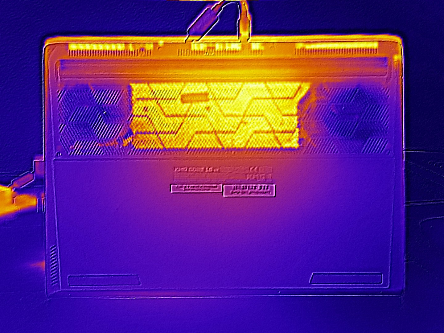 Под нагрузкой нижняя часть корпуса нагревается сильнее, достигая максимума в 57 °C, в то время как верхняя часть достигает пика в 46 °C. В режиме простоя температура шасси оседает на умеренных 25-31 °C.