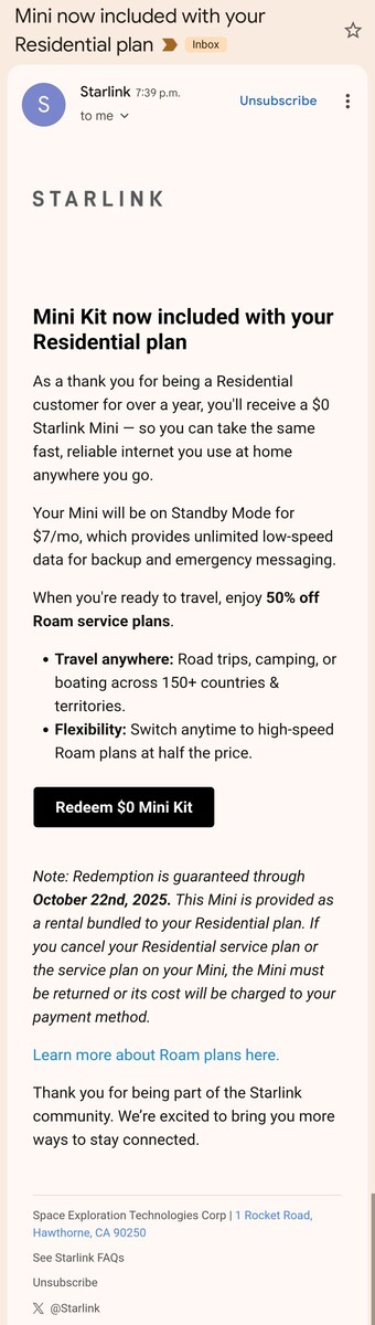 Счастливые подписчики программы Residential, получившие письмо по адресу https://www.reddit.com/r/Starlink/comments/1o1tztj/starlink_deal_spacex_is_offering_longtime_us_and/ смогут получить тарелку Starlink Mini без дополнительной платы. Все, что Вам нужно сделать, это нажать на кнопку "Redeem $0 Mini Kit" в письме, подтвердить заказ, и антенна будет доставлена на Ваш адрес. SpaceX отмечает, что ссылка на выкуп действительна до 22 октября. Кроме того, в письме также упоминается, что пользователи получат 50% скидку на тарифные планы Roam, то есть Вам придется заплатить всего $82,5 за тарифный план Roam Unlimited и $25 за Mini Roam. Обычно эти тарифные планы стоят $165 и $50 соответственно. Пока неясно, действует ли скидка только в течение первых нескольких месяцев обслуживания или это постоянная привилегия для пользователей Residential.