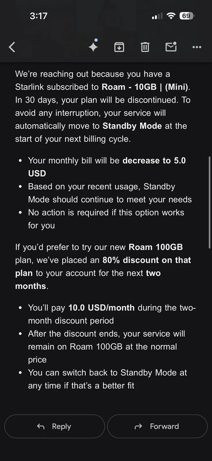 Starlink не желает этого и теперь предупреждает пользователей своего тарифного плана за $10, что они будут автоматически переведены на режим ожидания за $5, поскольку, судя по характеру их использования, этого будет достаточно для удовлетворения их потребностей.