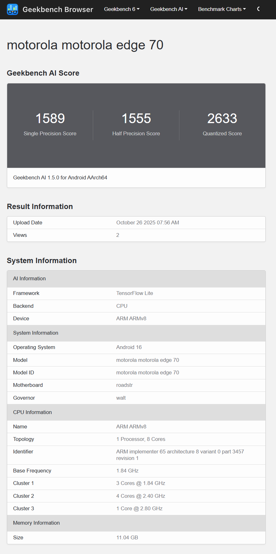 Как показано на изображении ниже, Motorola использует этот чипсет в паре с 12 Гб оперативной памяти и 512 Гб накопителем. Согласно ранним результатам Geekbench, сочетание Snapdragon 7 Gen 4 и 12 ГБ оперативной памяти позволяет Edge 70 сравняться по производительности процессора с MediaTek Dimensity 8350-на базе Edge 60 Pro который был выпущен до него.