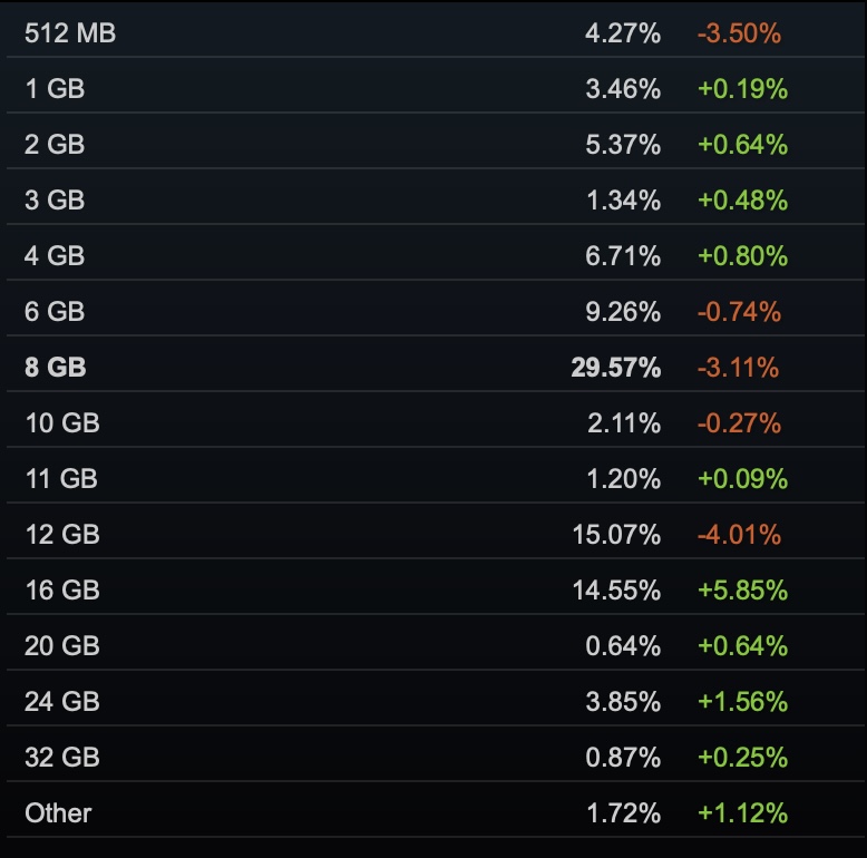 В недавнем бета-обновлении для Steam Clientvalve заявила, что были решены некоторые проблемы, влияющие на отчетность по VRAM, что указывает на то, что в предыдущих опросах могли быть неверные данные. Более того, для систем с несколькими графическими процессорами Steam теперь будет сообщать только о том GPU, который имеет наибольший объем VRAM.