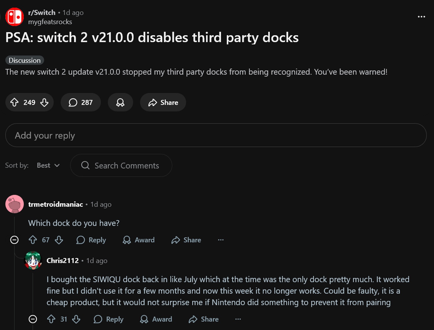 В одном из примеров, опубликованных на Reddit, была затронута популярная док-станция для Switch 2 от Siwiqu. Крис2112 объясняет, что он приобрел док-станцию в июле и не испытывал никаких проблем. К сожалению, спустя несколько месяцев это уже не так. Геймер подозревает, что в этом виновато последнее обновление прошивки Nintendo, и это утверждение подтверждают некоторые другие читатели.