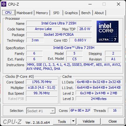 Intel Core Ultra 7 255H это высокопроизводительный процессор для ноутбуков с 16 ядрами (6 производительных, 8 эффективных и 2 маломощных), работающими на частоте до 5,1 ГГц.