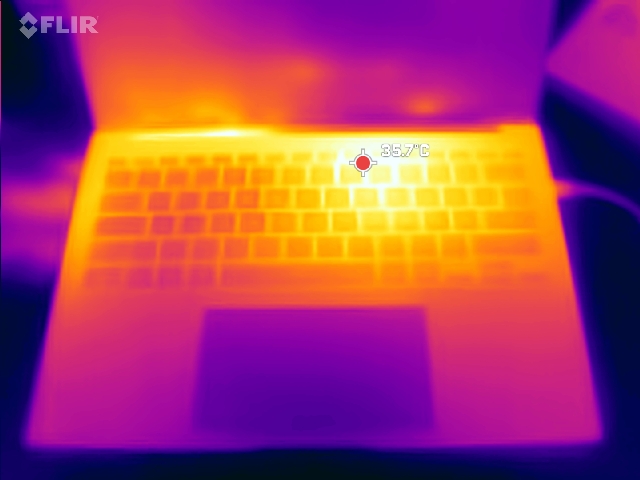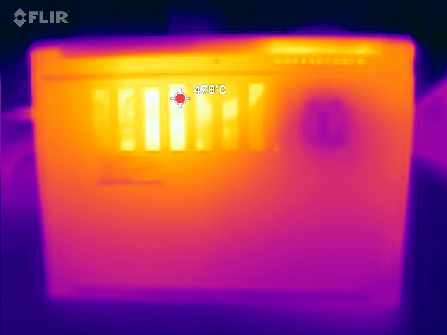 Горячая точка при полной нагрузке достигает 47 °C, примерно так же, как у Версия AMD (на нижней стороне рядом с дисплеем). Однако система Intel остается немного прохладнее на стороне, удаленной от единственного вентилятора. В частности, левая область клавиатуры и подставка для ладоней остаются комфортно прохладными.