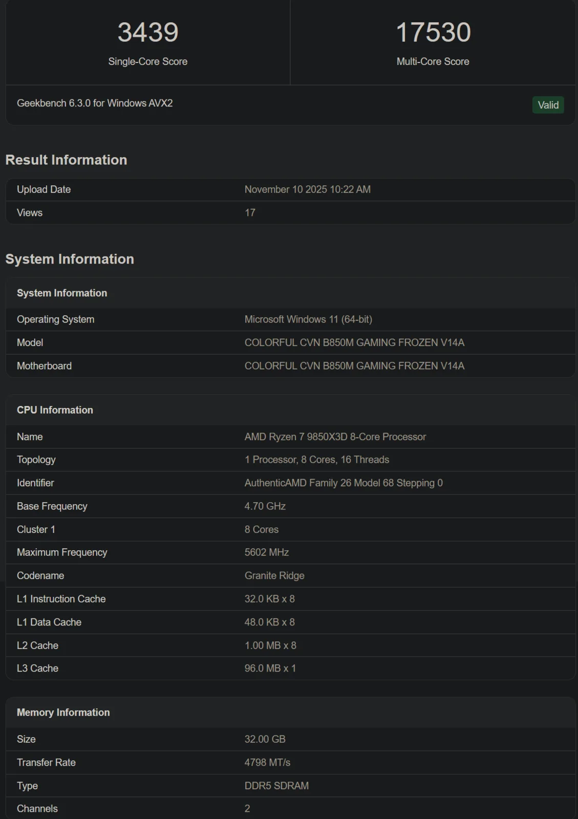 В одном из них она составляет 5,6 ГГц, а в другом - 5,4 ГГц. Опять же, чип тестировался на разных материнских платах, и это могло повлиять на результаты. В первом прогоне вместе с Colorful B850M Ryzen 7 9850X3D набирает 3 439 и 17 530 баллов, а во втором (материнская плата Maxsun B850ITX) - 3 260/16 149.
