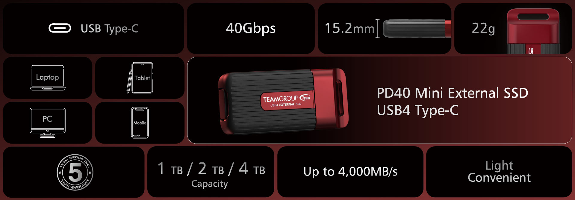 Компания Team Group представила новый портативный накопитель - PD40 Mini External SSD. Он поставляется с интерфейсом USB4, но также совместим с устройствами USB 3.2 и USB 2.0. Тем не менее, благодаря более быстрому порту Type-C, компания утверждает, что он может обеспечить скорость чтения до 4 000 МБ/с.