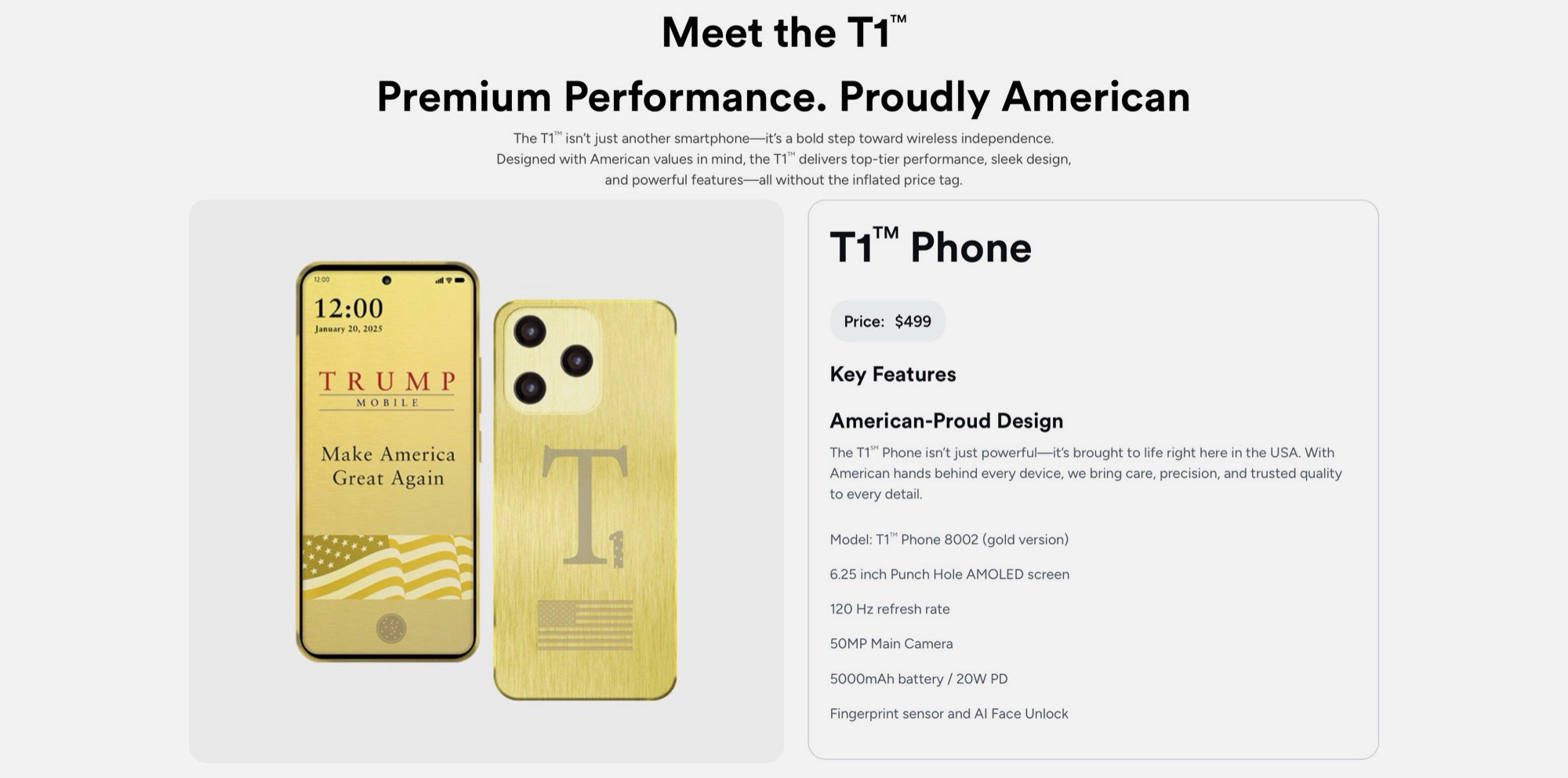 Телефон Трампа T1 был представлен в середине июня 2025 года. Этот смартфон среднего ценового диапазона, стоимостью 499 долларов, по своим техническим характеристикам скорее соответствует гораздо более дешевым устройствам начального уровня. Предварительные заказы начались вскоре после анонса, при этом первые покупатели должны были внести предоплату в размере $100. Всего через две недели после своего дебюта Trump Mobile уже изменил свои технические характеристики и подтвердил, что он не является "Сделано в США", как было заявлено изначально.