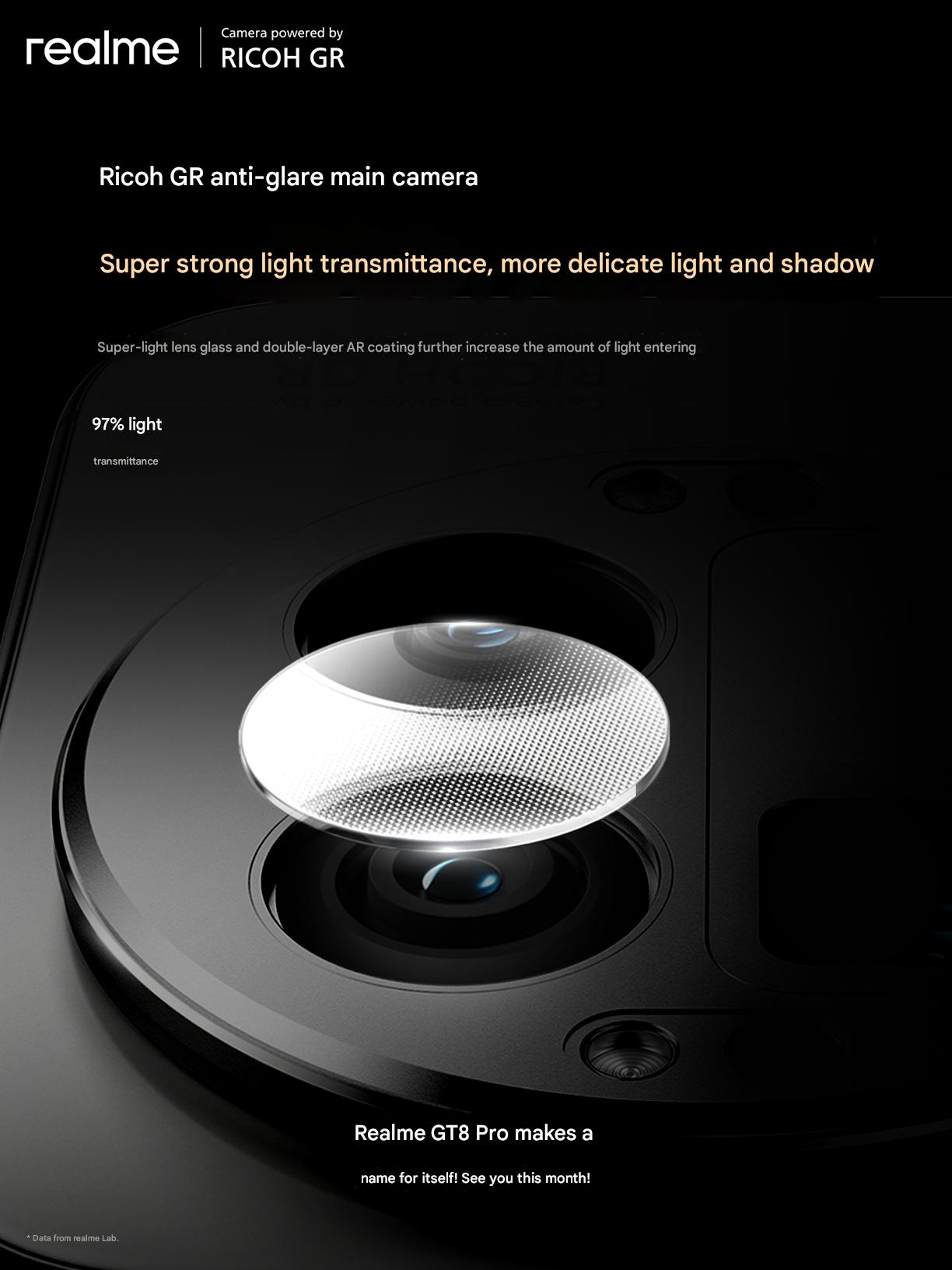 Вероятно, основная камера Realme GT8 Pro сохранит 23-миллиметровый объектив, но при этом предложит возможность переключения на 28 мм или 40 мм (представленный в Ricoh GR IIIx) через приложение камеры. Эти два фокусных расстояния особенно хорошо подходят для уличной фотографии - области, в которой Ricoh GR традиционно пользуется значительным авторитетом. Также будет включен режим видоискателя. В официальных тизерах, недавно опубликованных на сайтах Weibo и X, компания Realme сообщила, что GT8 Pro оснащен "антибликовым" объективом - аналогичным покрытию Zeiss T*, которое можно встретить на флагманах Vivo - для уменьшения нежелательных артефактов, таких как отражения, и получения детализированных и ярких снимков