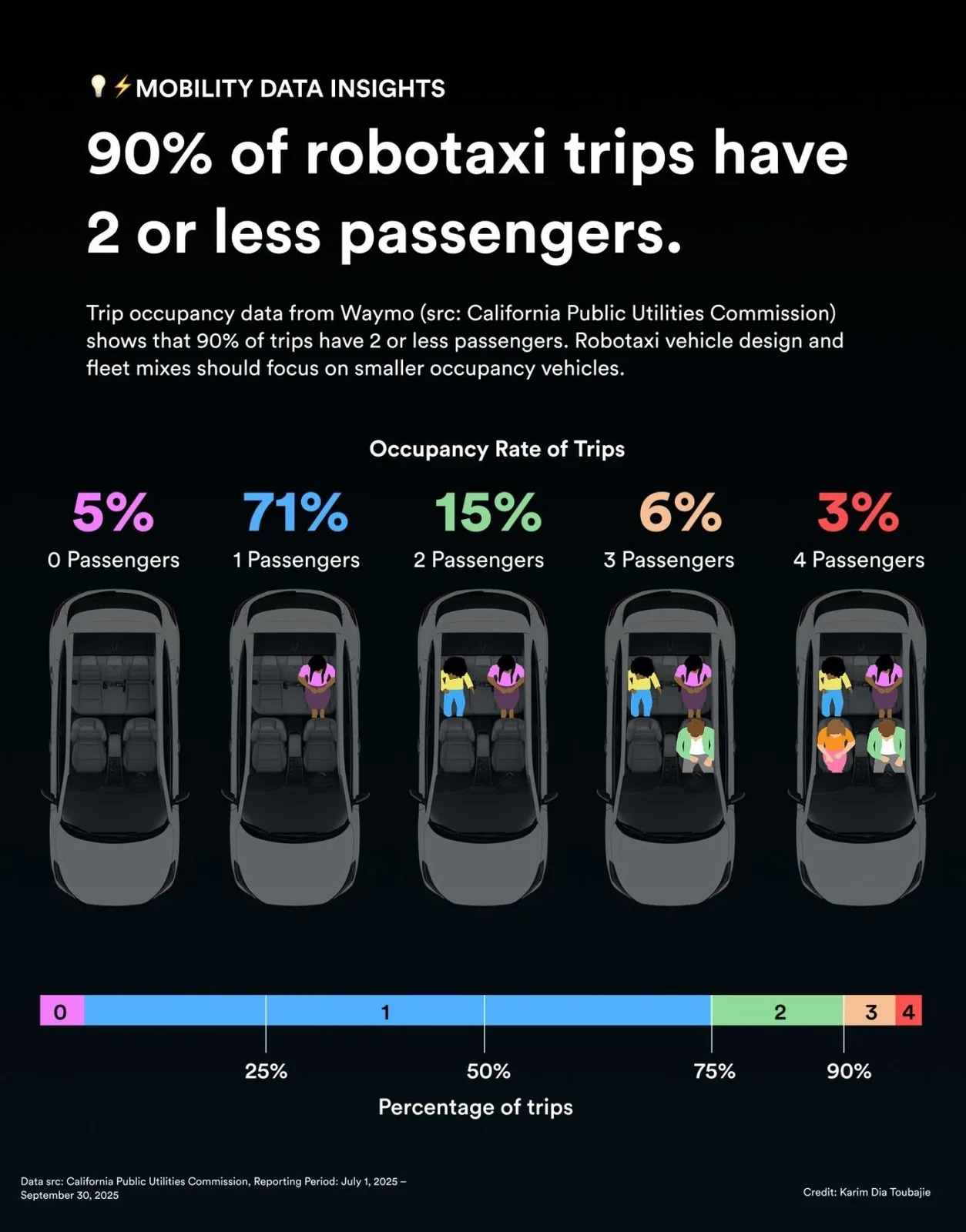 Двухместный концепт теперь подтверждается последними статистическими данными о количестве пассажиров в автомобиле Waymo. Оказывается, 90% поездок без водителя на роботакси совершаются с одним или двумя людьми. Подавляющее большинство из них также едут с одним человеком, и только 9% включают хотя бы одного человека на передних сиденьях.
