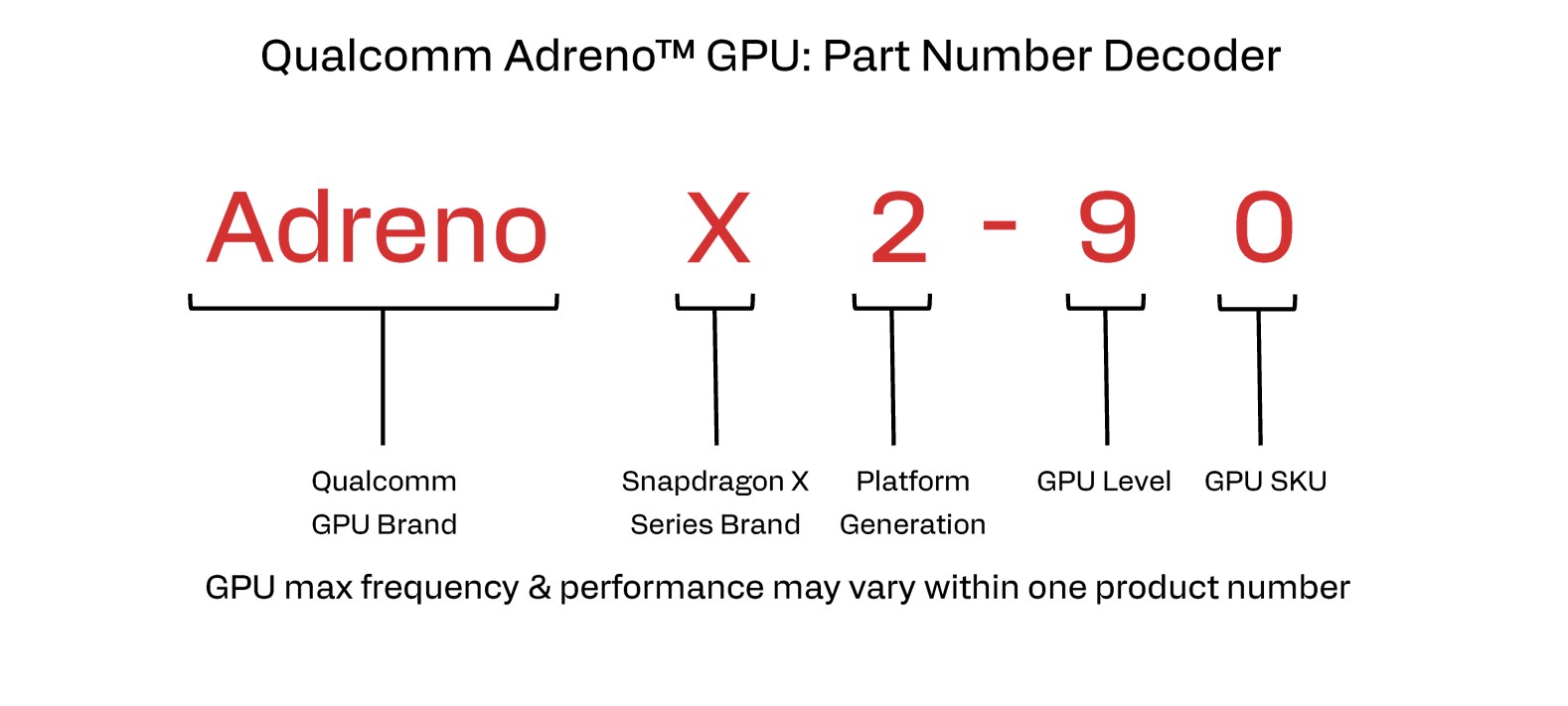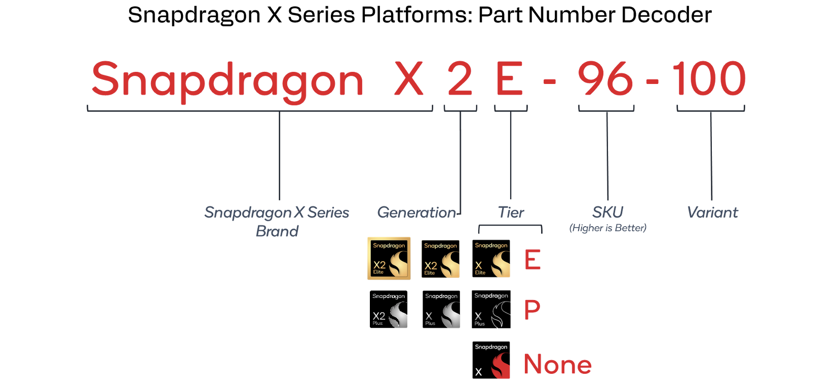Новое поколение Snapdragon X2 начинается с самых мощных версий, и в дополнение к чипам Snapdragon X2 Elite мы также получим процессоры X2 Elite Extreme. Номенклатура была довольно запутанной уже в первом поколении, и теперь она ничуть не проще. На следующих двух изображениях показана номенклатура процессора, а также графического адаптера и их значение.
