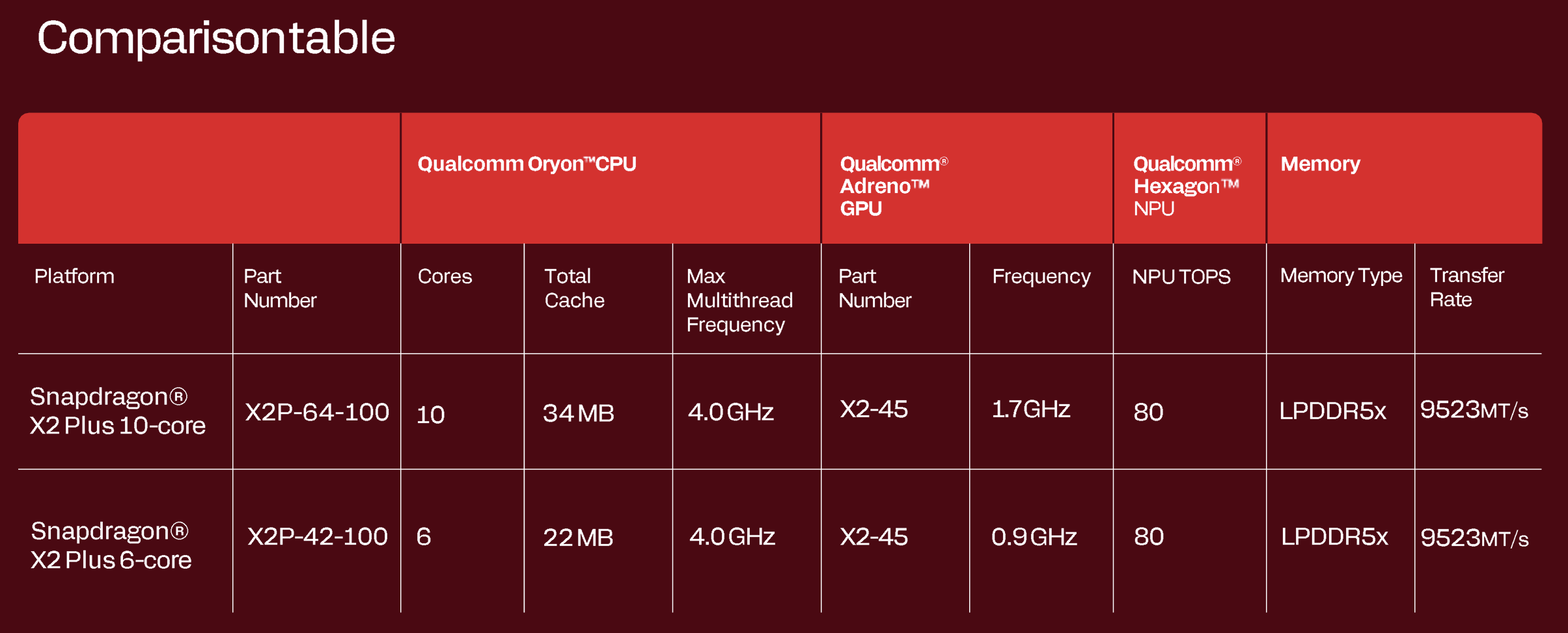 Учитывая количество доступных процессоров (см. таблицу ниже), такая номенклатура может быстро запутать, и она не является идеальной для покупателей. Помимо моделей X2 Elite, а также X2 Elite Extreme, Qualcomm также выпускает две модели X2 Plus для устройств более низкого класса. Как всегда, производительность чипов будет варьироваться между различными устройствами из-за разных ограничений по мощности. Кроме того, часы GPU снова зависят от модели процессора, поэтому даже если два GPU имеют одинаковое название (например, Adreno X2-90), часы и, следовательно, производительность могут заметно отличаться.