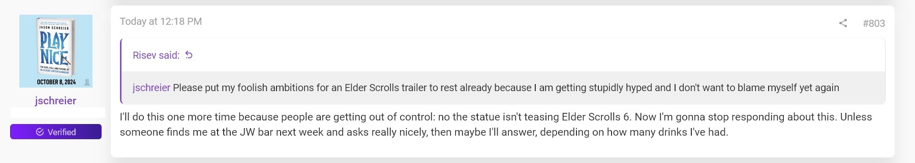 Шрайер, который, возможно, точно знает, для чего предназначена статуэтка, посчитал необходимым внести ясность. На форумах ResetEraон сказал: "Я сделаю это еще раз, потому что люди выходят из-под контроля: нет, статуя не дразнит Elder Scrolls 6. Теперь я перестану отвечать на эти вопросы"